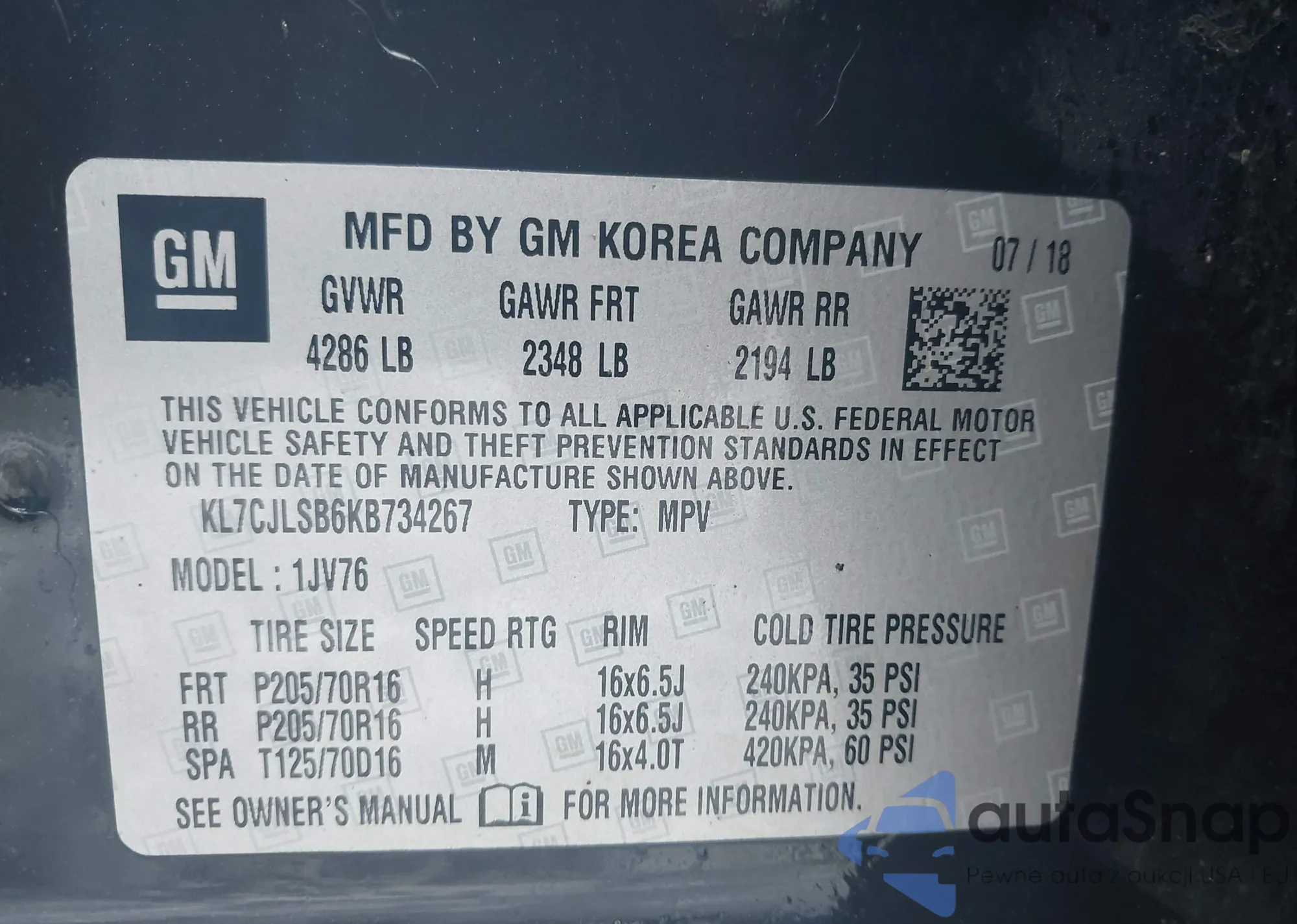 VIN: KL7CJLSB6KB734267