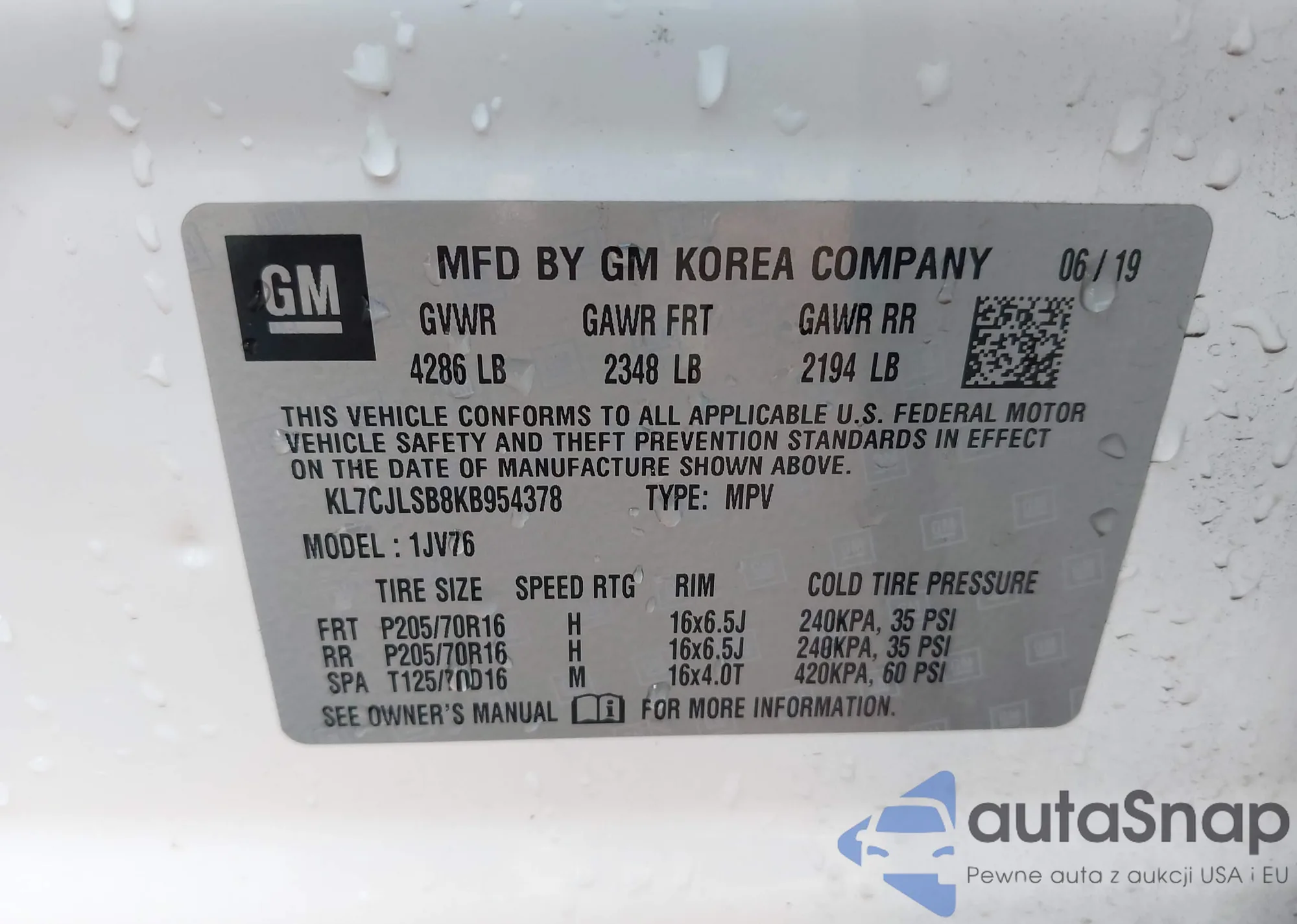 The car Chevrolet Trax 2019 (VIN KL7CJLSB8KB954378) has not been auctioned before. The documents are clean, and the mileage matches or is below the market average. Sold by an insurance company – we recommend purchase. Delivery to the port will take approx. 6–8 weeks.