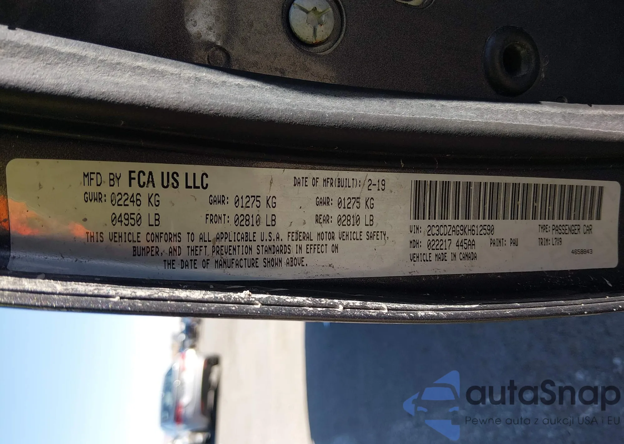 The car Dodge Challenger 2019 (VIN 2C3CDZAG9KH612590) has not been auctioned before. The documents are clean, and the mileage matches or is below the market average. Sold by an insurance company – we recommend purchase. Delivery to the port will take approx. 6–8 weeks.