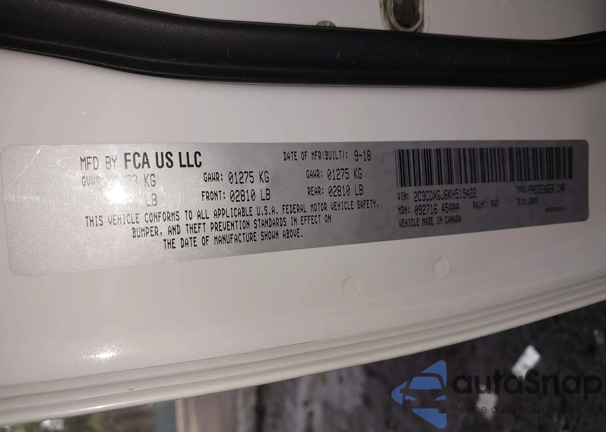 The car Dodge Charger 2019 (VIN 2C3CDXGJ6KH519422) has not been auctioned before. The documents are clean, and the mileage matches or is below the market average. Sold by an insurance company – we recommend purchase. Delivery to the port will take approx. 6–8 weeks.