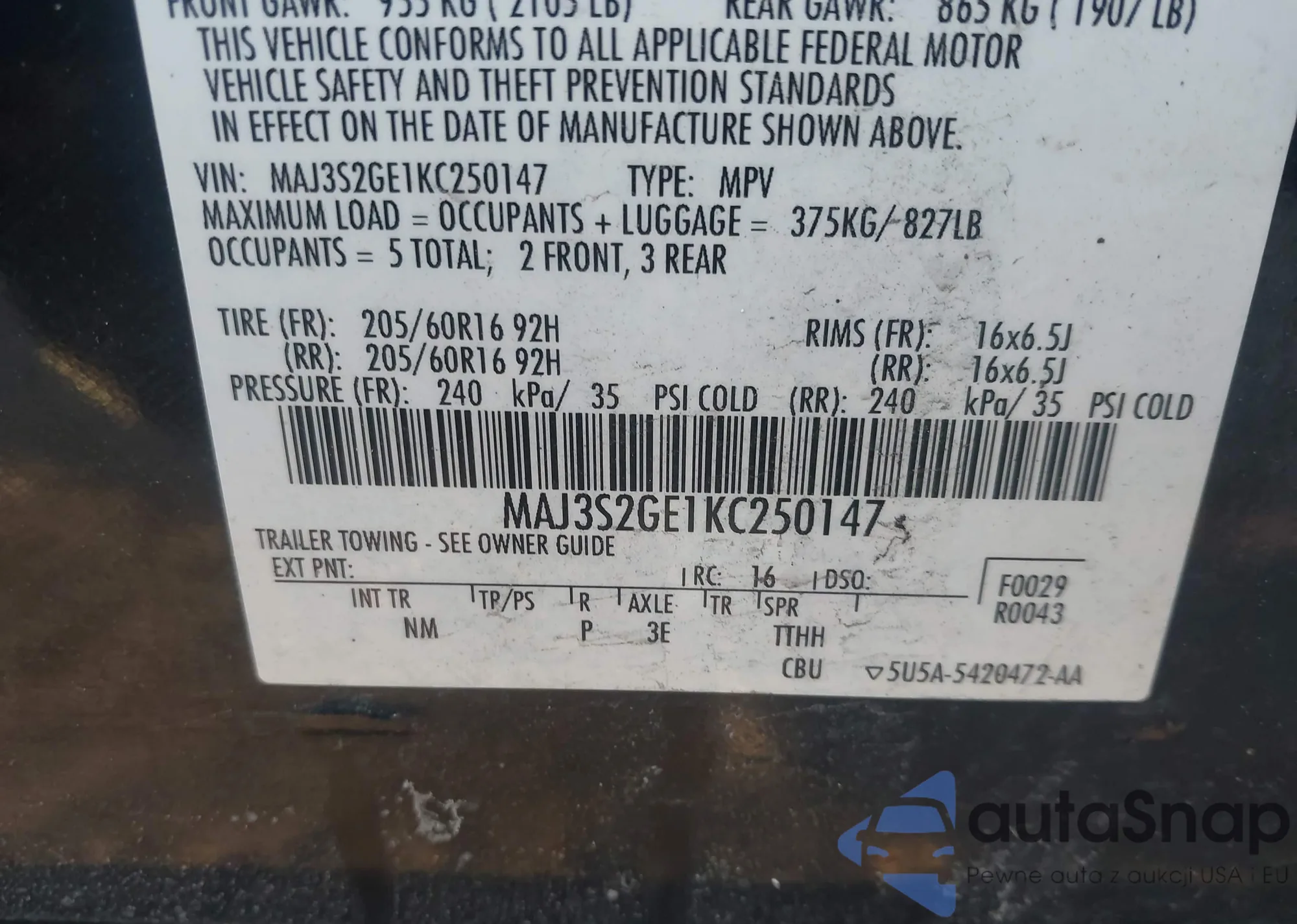 • VIN: MAJ3S2GE1KC250147