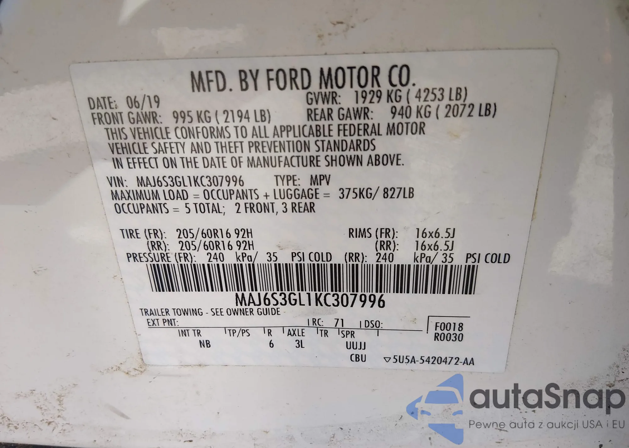 The car Ford EcoSport 2019 (VIN MAJ6S3GL1KC307996) has not been auctioned before. The documents are clean, and the mileage matches or is below the market average. Sold by an insurance company – we recommend purchase. Delivery to the port will take approx. 6–8 weeks.