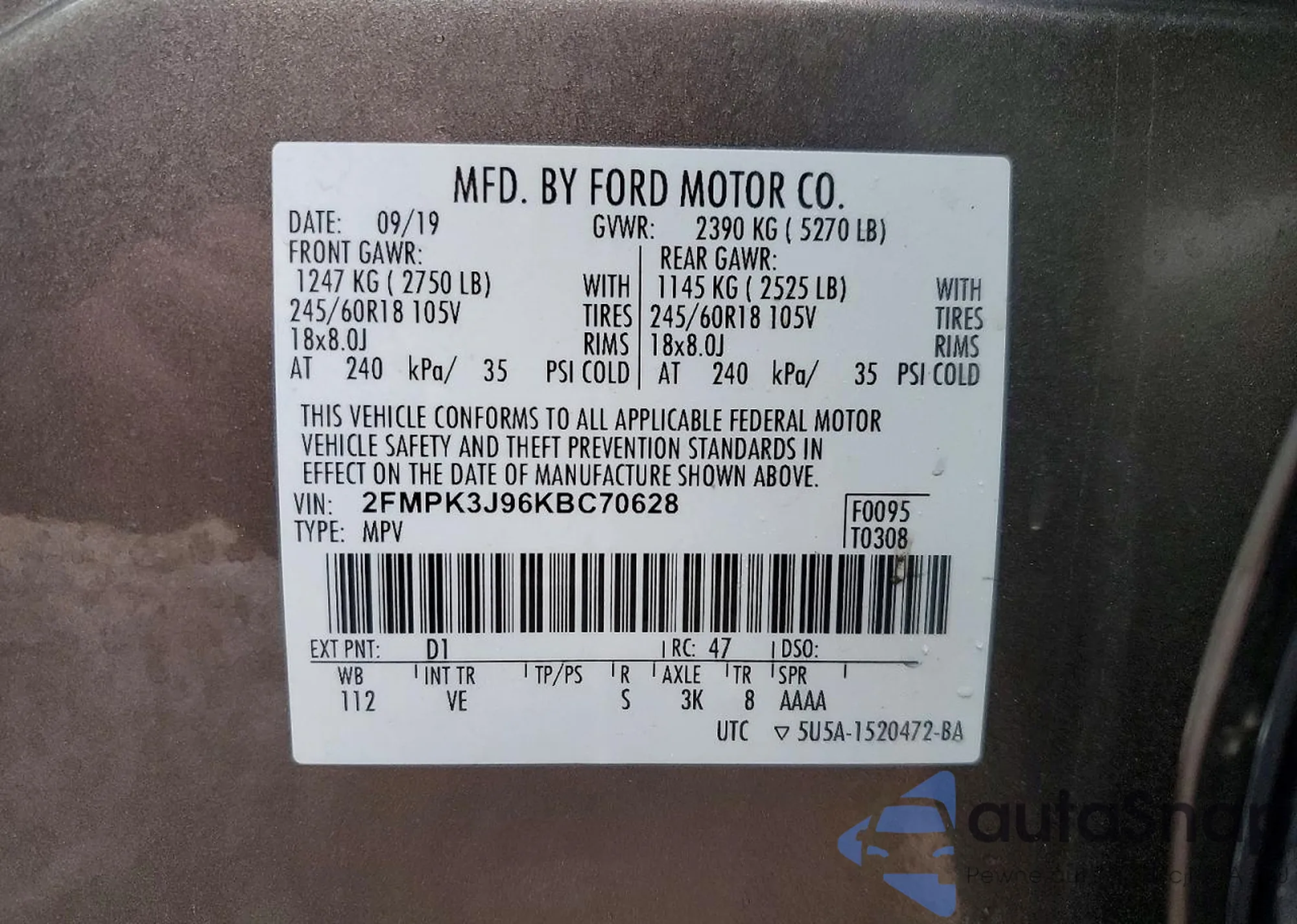 VIN: 2FMPK3J96KBC70628