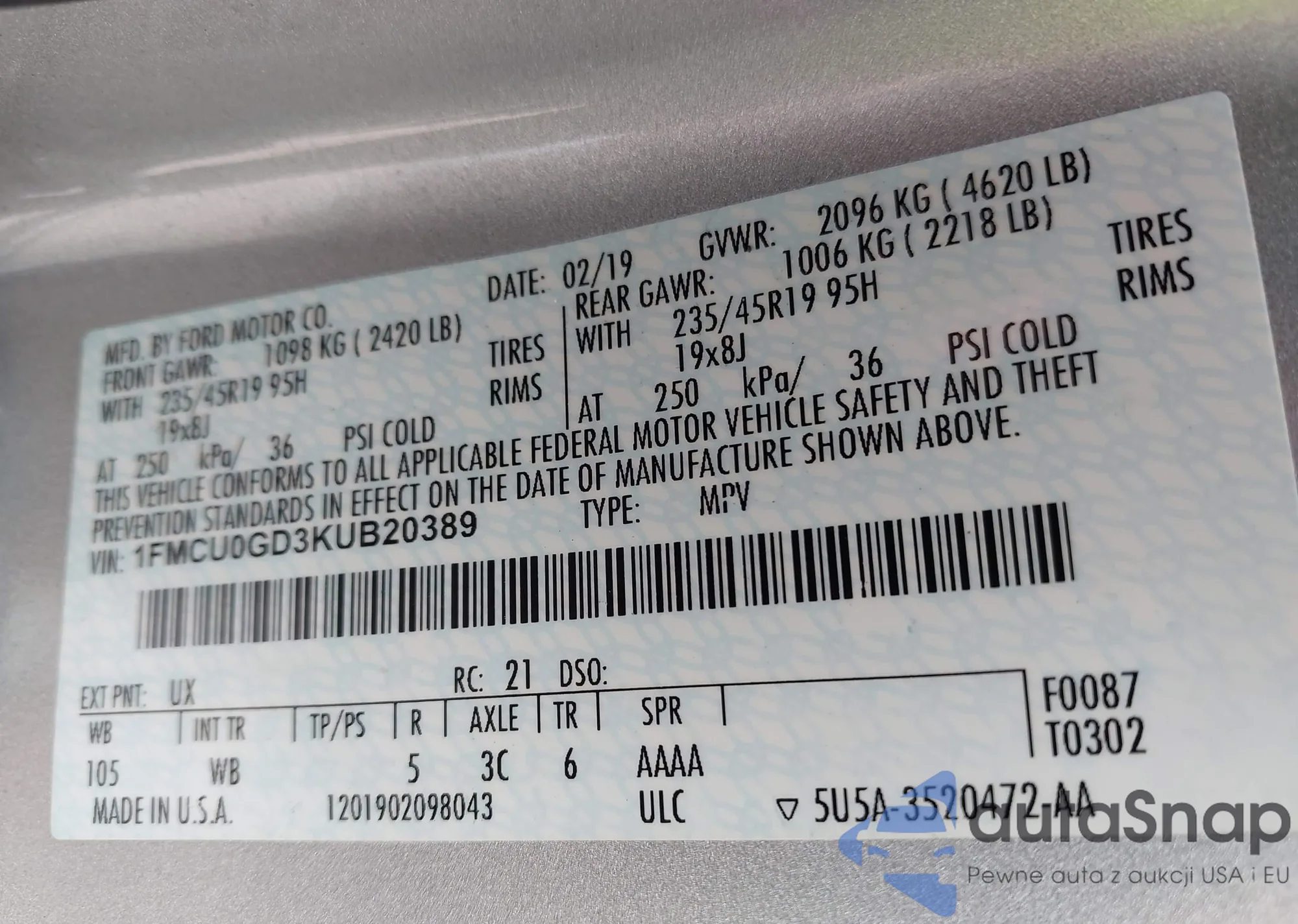 VIN: 1FMCU0GD3KUB20389