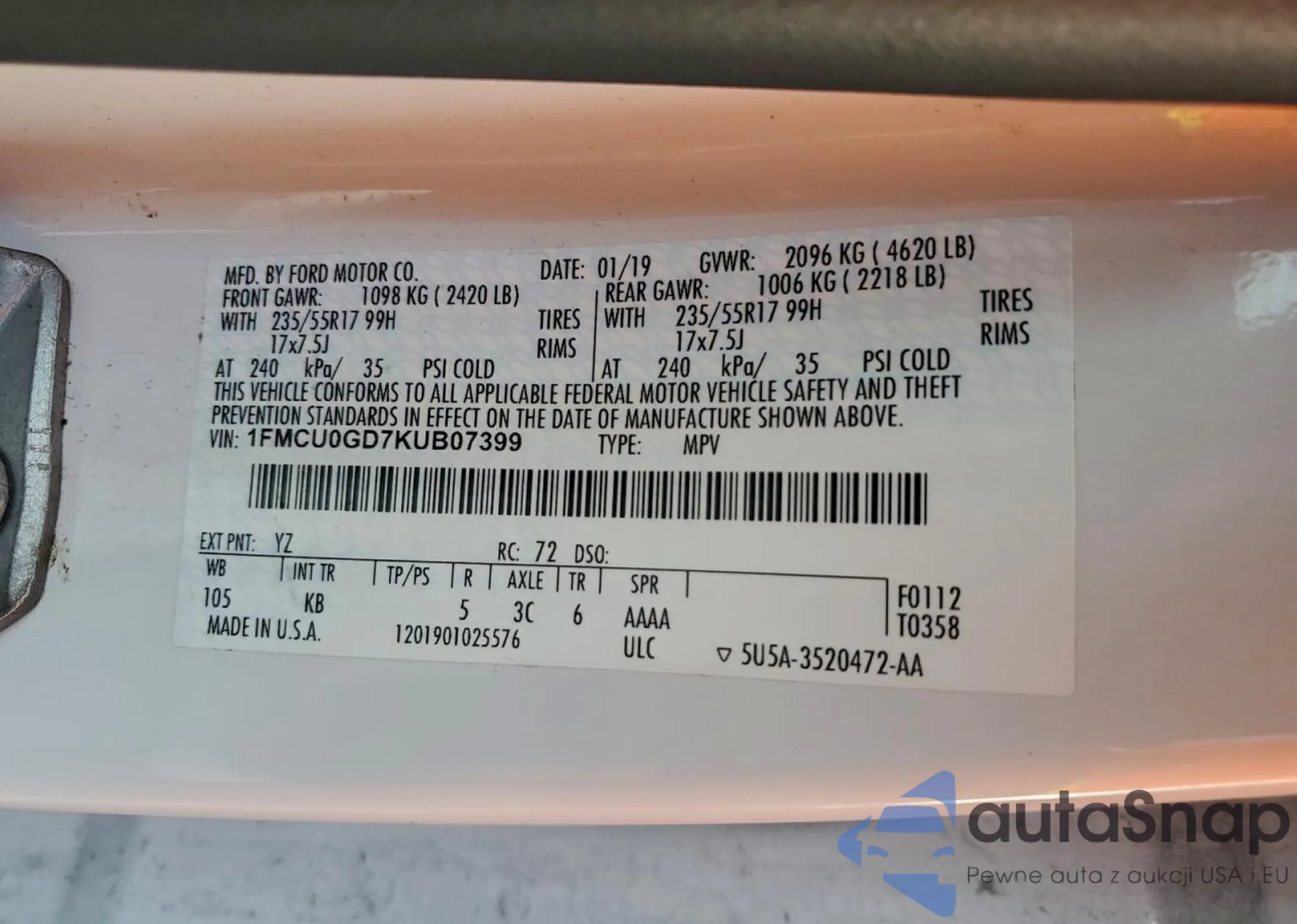 VIN: 1FMCU0GD7KUB07399