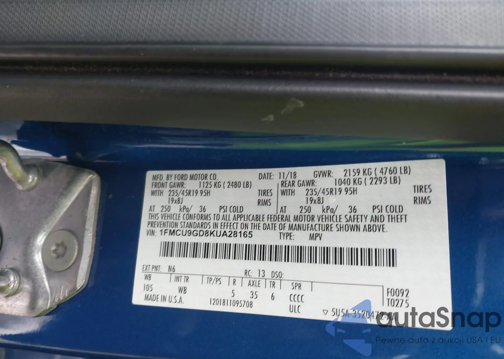 The car Ford Escape 2019 (VIN 1FMCU9GD8KUA28165) has not been auctioned before. The documents are clean, and the mileage matches or is below the market average. Sold by an insurance company – we recommend purchase. Delivery to the port will take approx. 6–8 weeks.