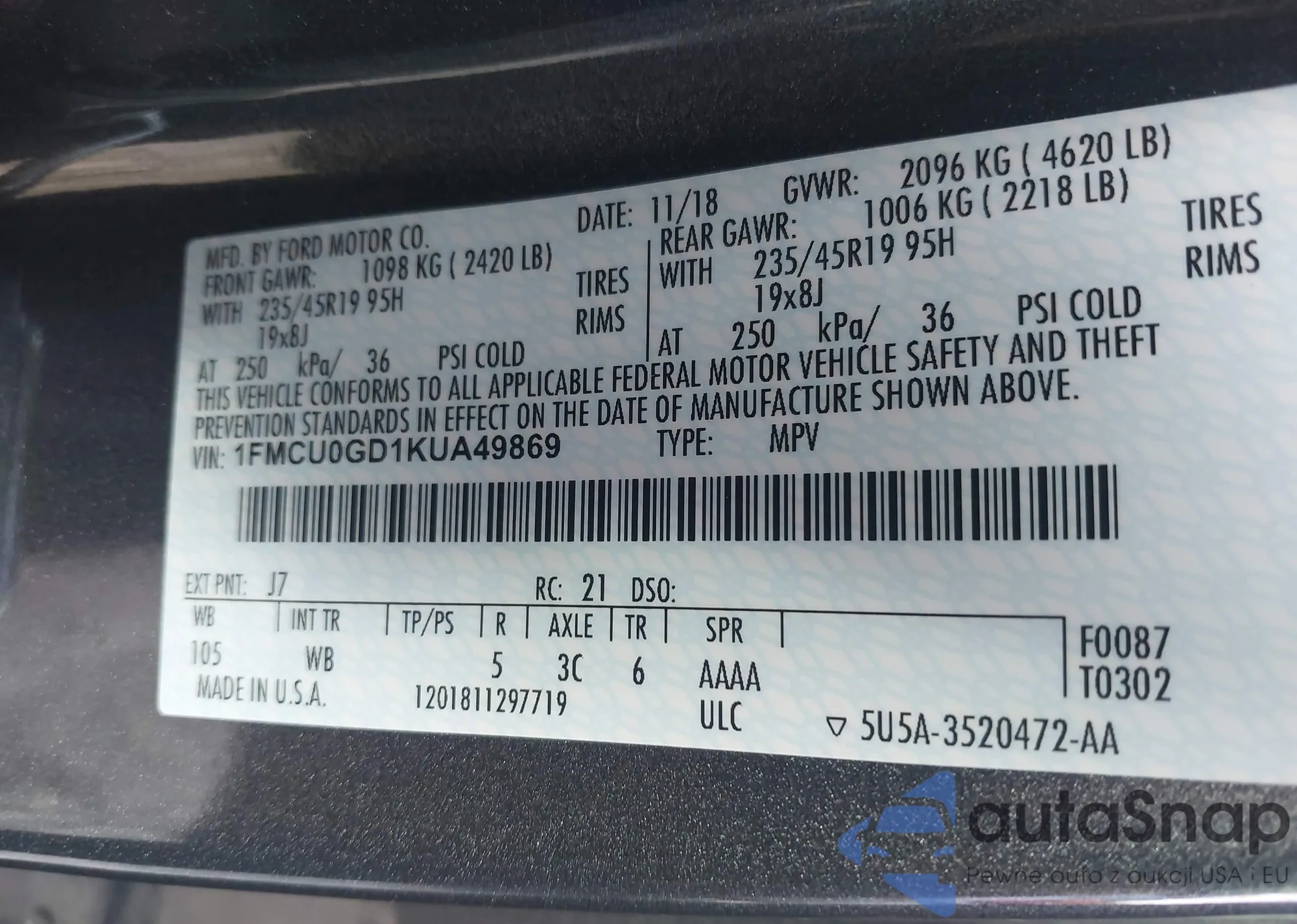 • VIN: 1FMCU0GD1KUA49869