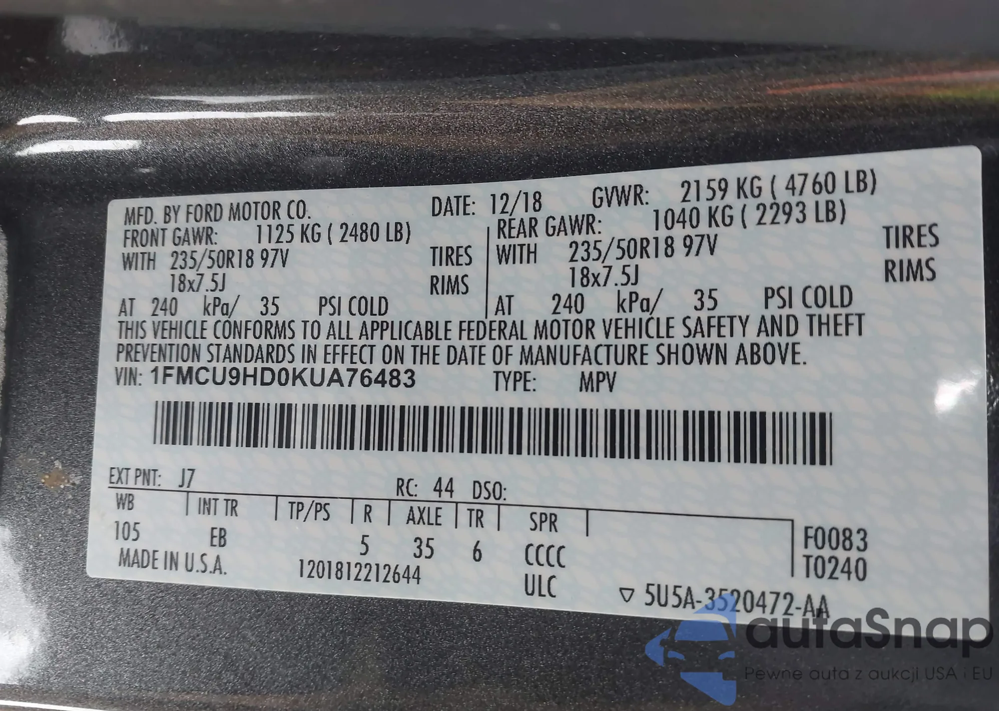 The car Ford Escape 2019 (VIN 1FMCU9HD0KUA76483) has not been auctioned before. The documents are clean, and the mileage matches or is below the market average. Sold by an insurance company – we recommend purchase. Delivery to the port will take approx. 6–8 weeks.