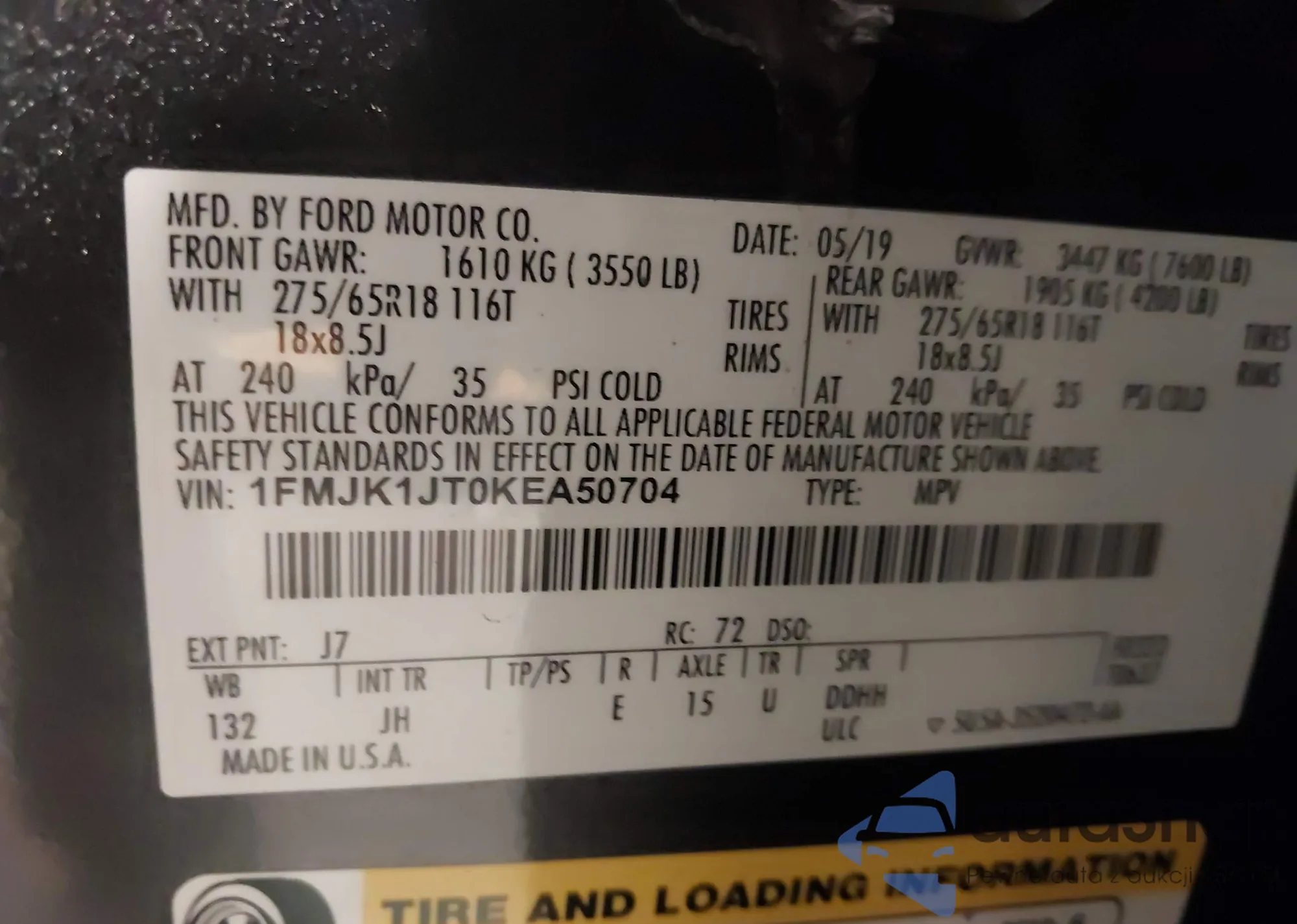 The car Ford Expedition 2019 (VIN 1FMJK1JT0KEA50704) has not been auctioned before. The documents are clean, and the mileage matches or is below the market average. Sold by an insurance company – we recommend purchase. Delivery to the port will take approx. 6–8 weeks.