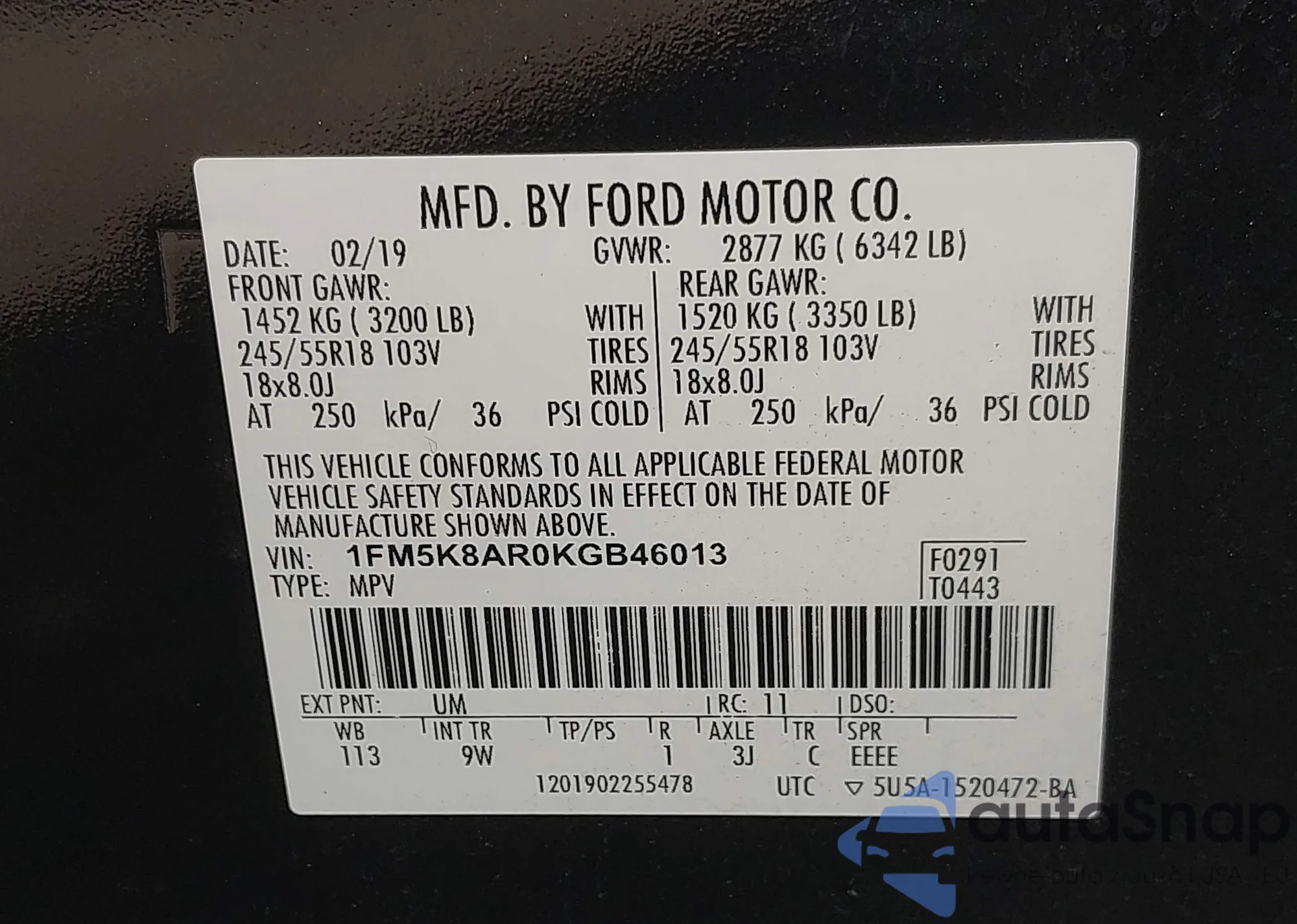 VIN: 1FM5K8AR0KGB46013