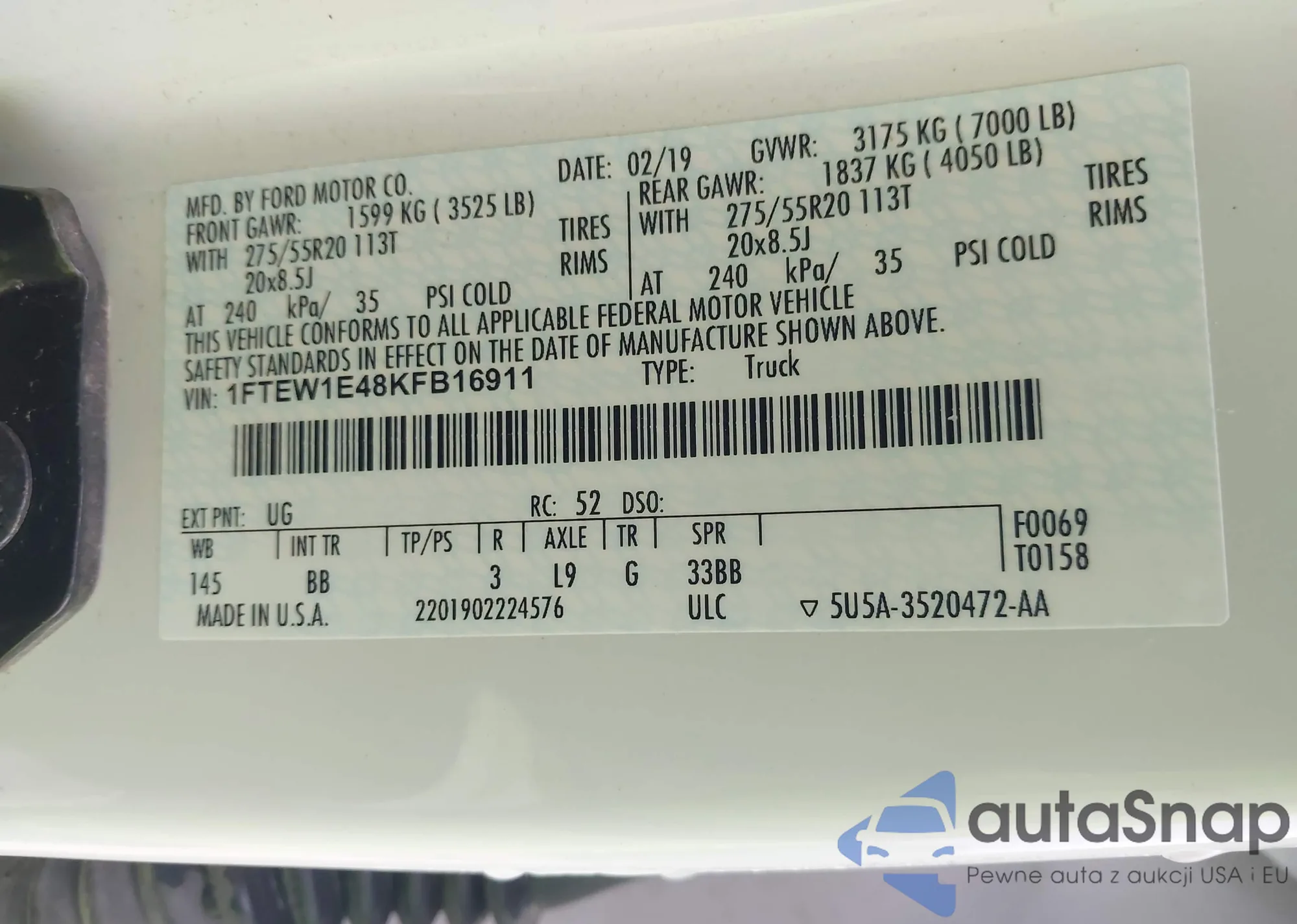 The car Ford F-150 2019 (VIN 1FTEW1E48KFB16911) has not been auctioned before. The documents are clean, and the mileage matches or is below the market average. Sold by an insurance company – we recommend purchase. Delivery to the port will take approx. 6–8 weeks.