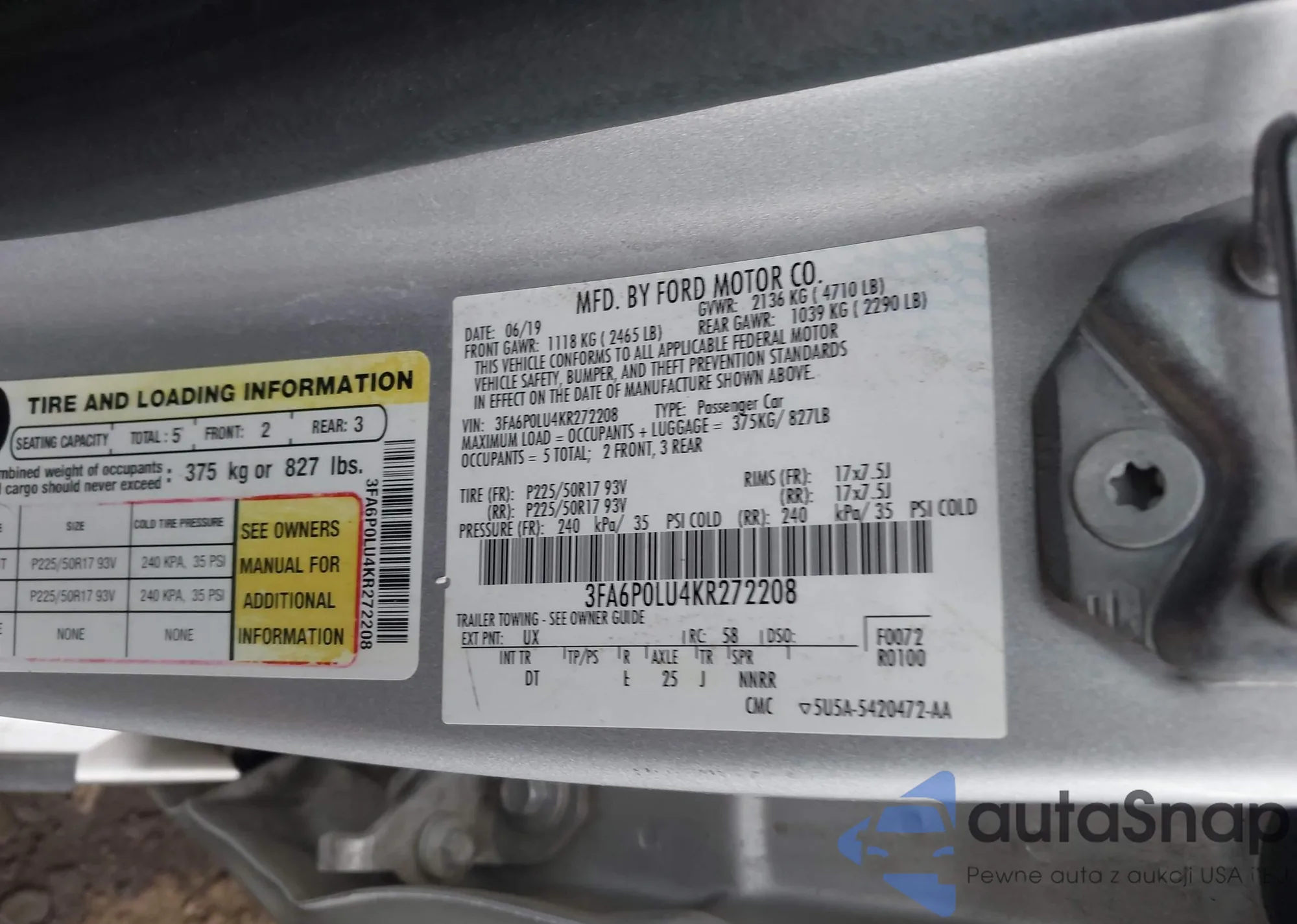 The car Ford Fusion 2019 (VIN 3FA6P0LU4KR272208) has not been auctioned before. The documents are clean, and the mileage matches or is below the market average. Sold by an insurance company – we recommend purchase. Delivery to the port will take approx. 6–8 weeks.