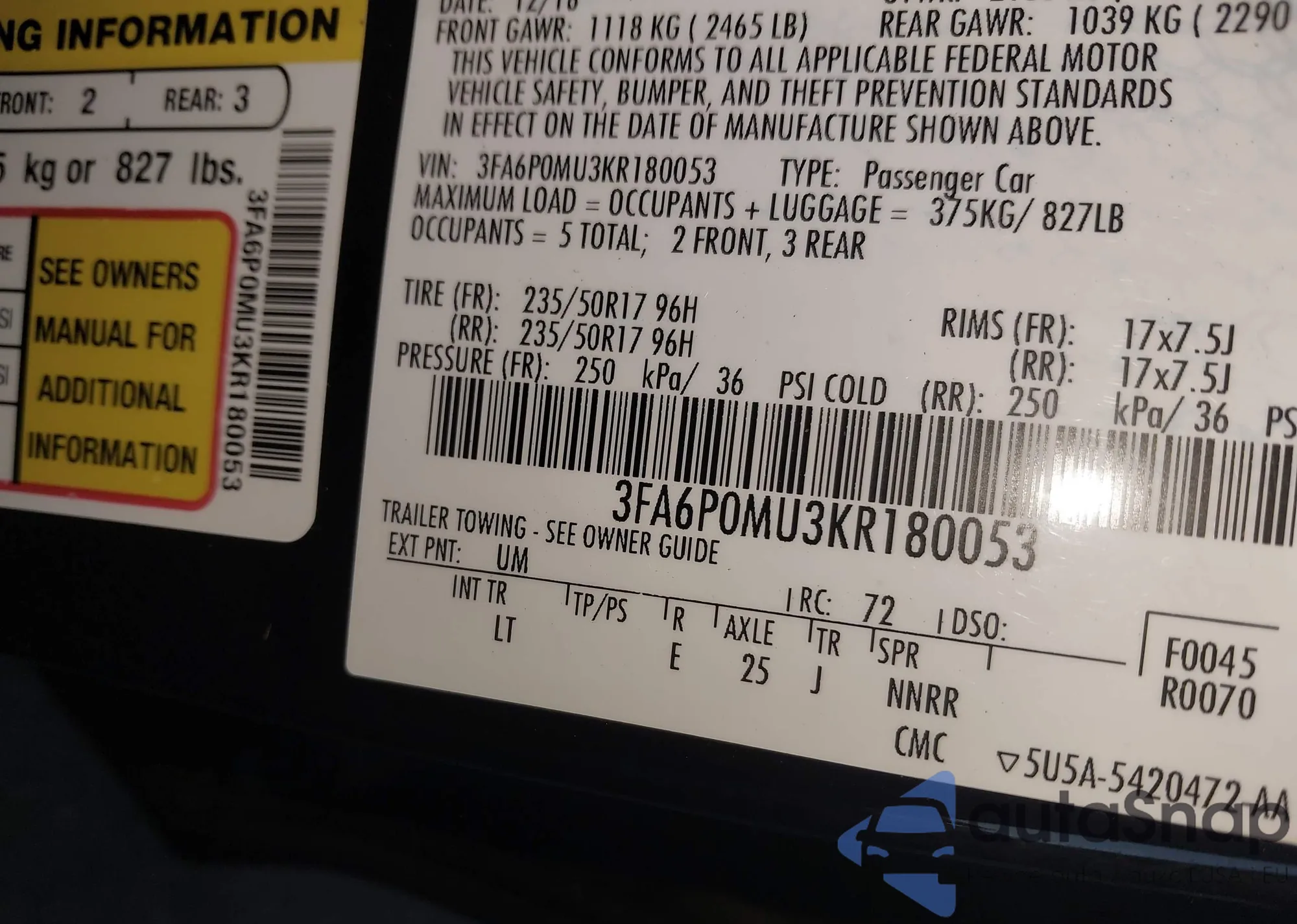 VIN: 3FA6P0MU3KR180053
