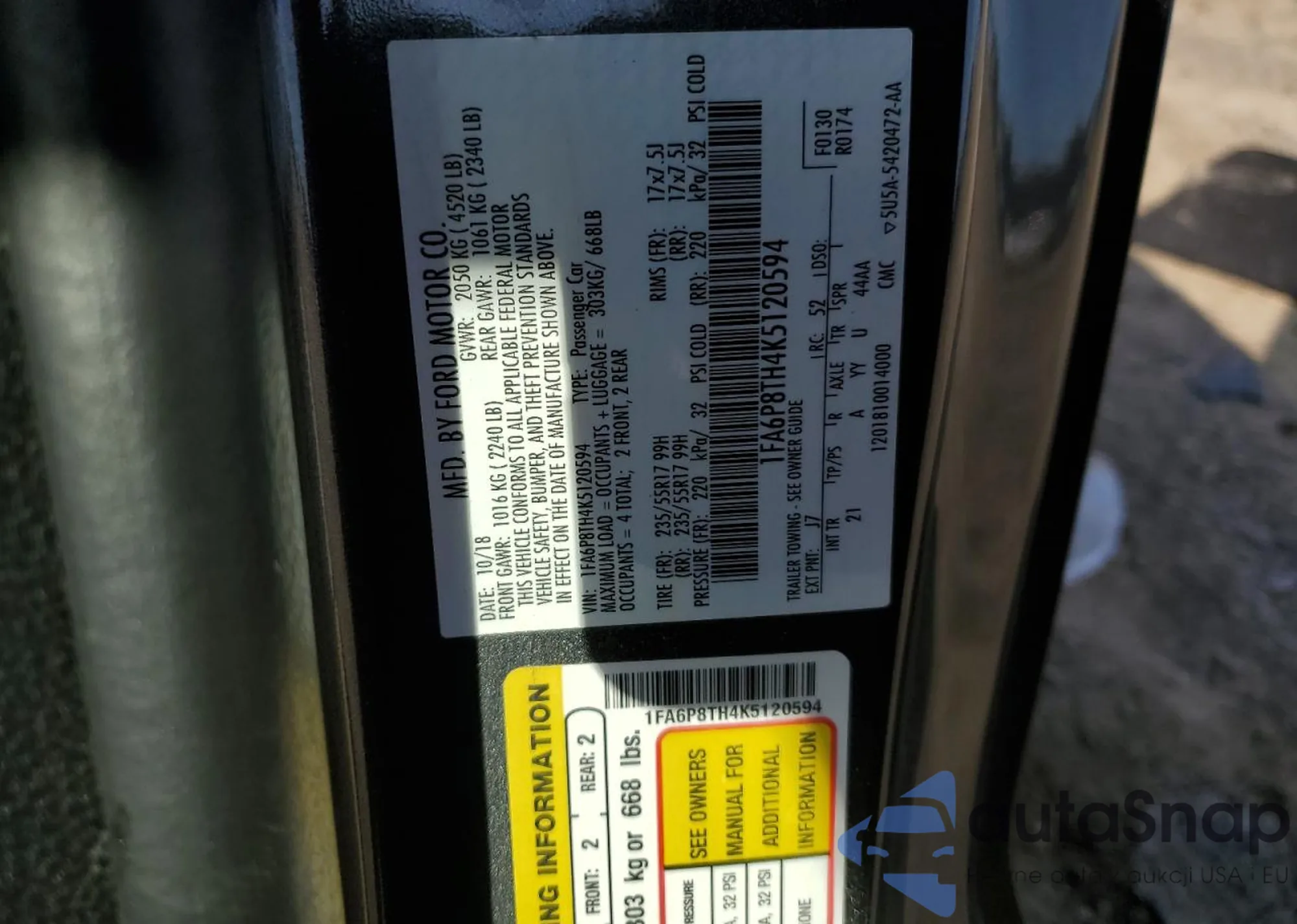 • VIN: 1FA6P8TH4K5120594