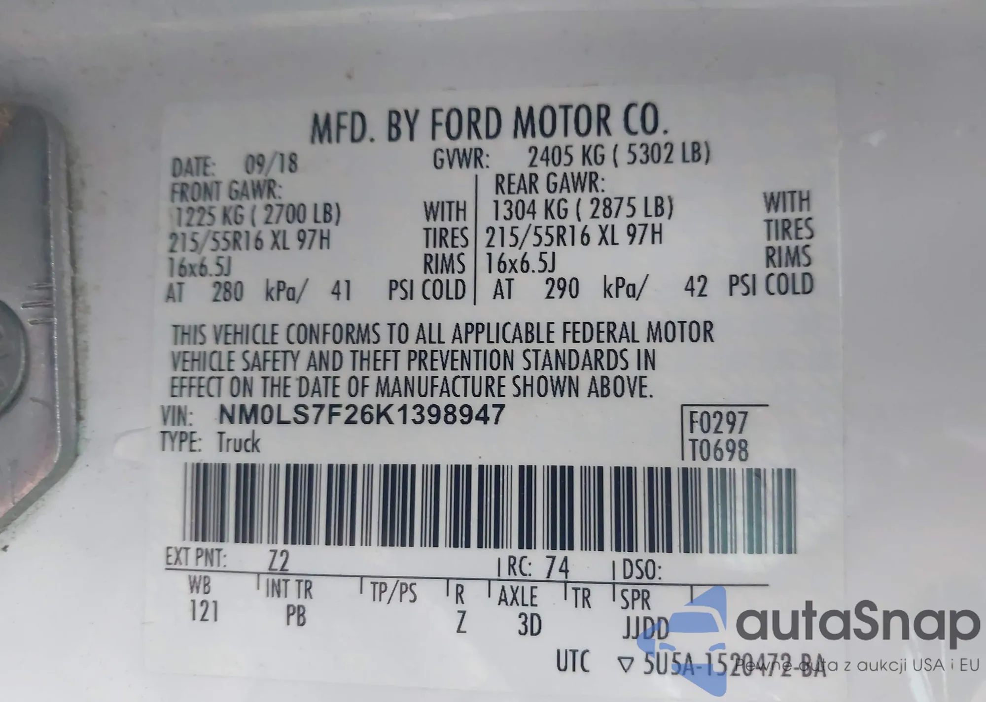 The car Ford Transit 2019 (VIN NM0LS7F26K1398947) has documents that prevent registration. Export and registration may be difficult. Contact AutaSnap experts to find alternatives.
