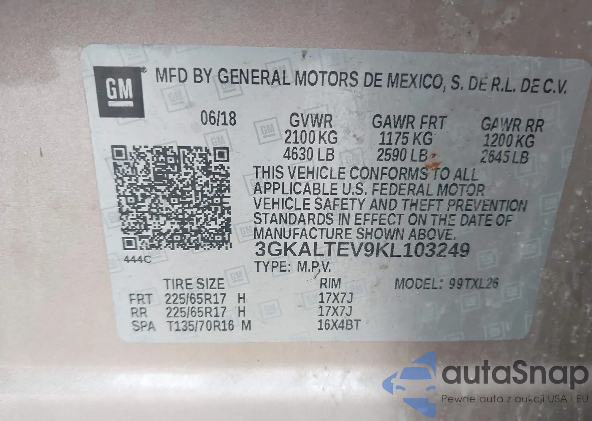 VIN: 3GKALTEV9KL103249
