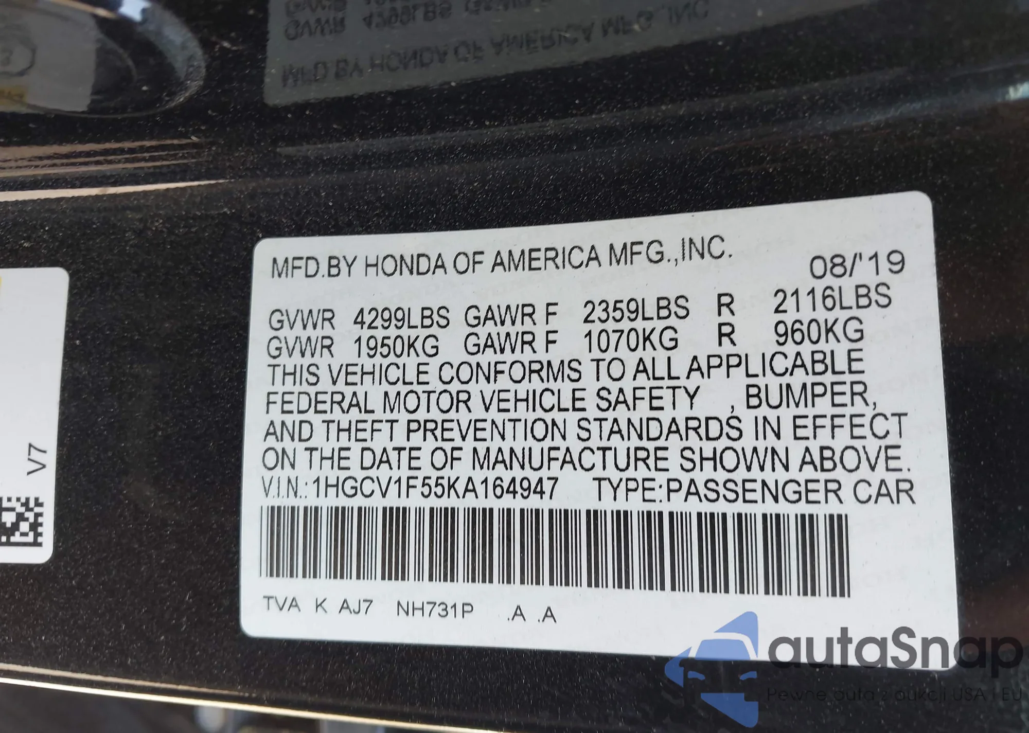VIN: 1HGCV1F55KA164947