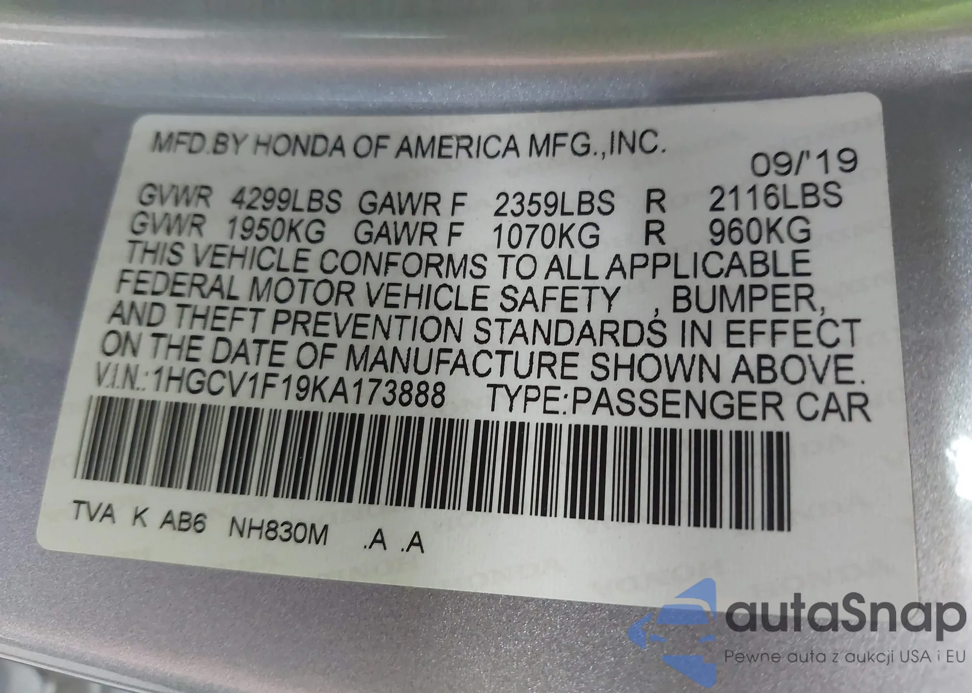 VIN: 1HGCV1F19KA173888