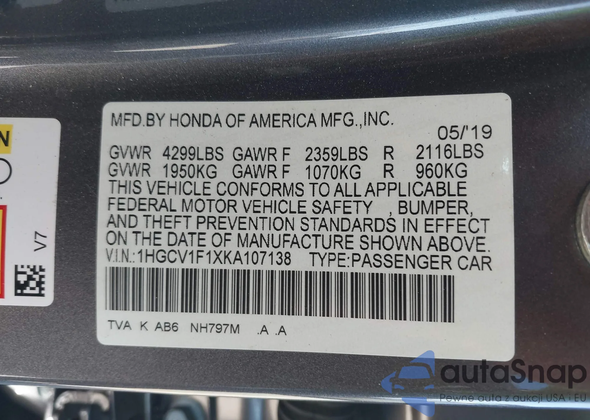 The car Honda Accord 2019 (VIN 1HGCV1F1XKA107138) has not been auctioned before. The documents are clean, and the mileage matches or is below the market average. Sold by an insurance company – we recommend purchase. Delivery to the port will take approx. 6–8 weeks.