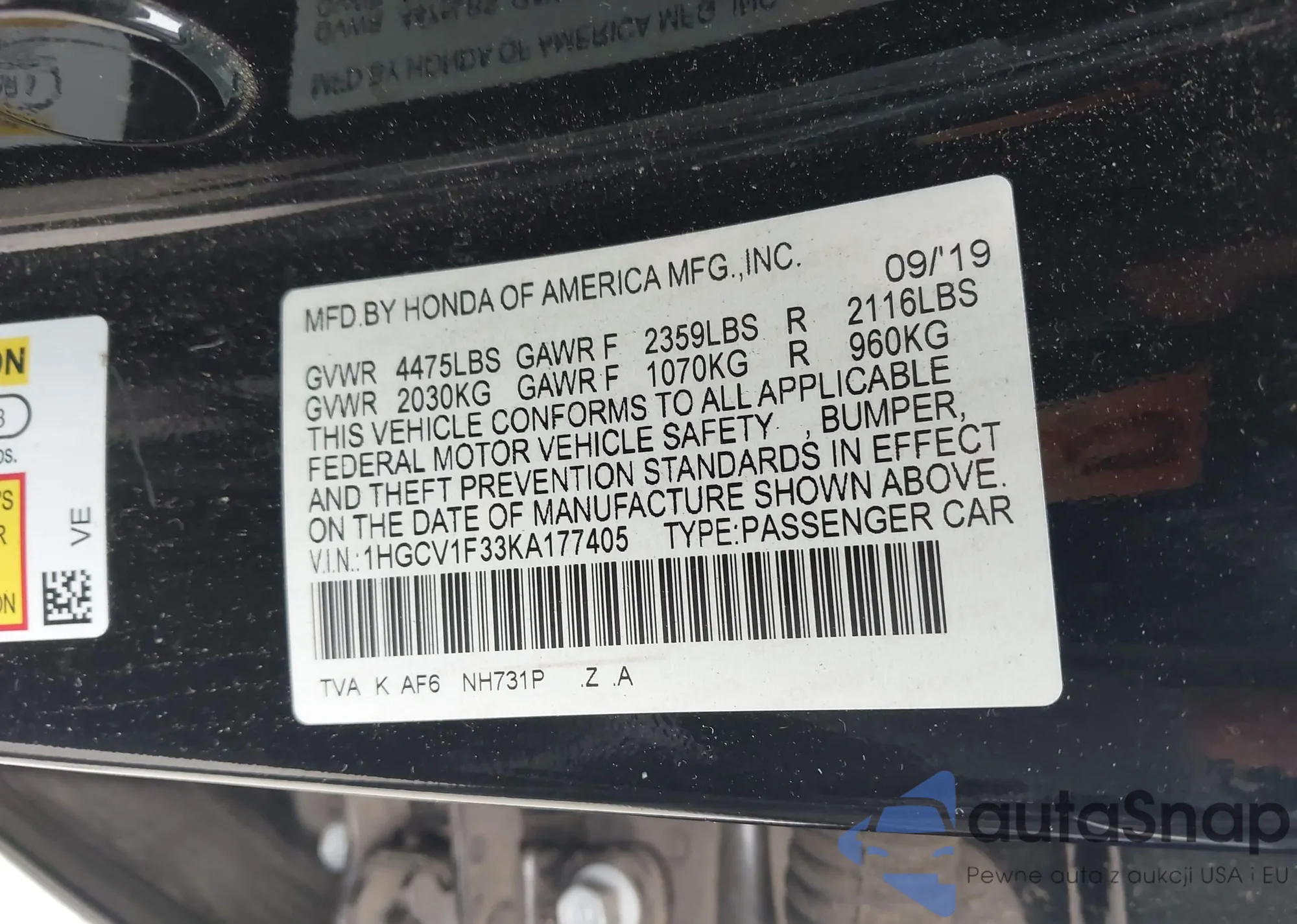 The car Honda Accord 2019 (VIN 1HGCV1F33KA177405) has not been auctioned before. The documents are clean, and the mileage matches or is below the market average. Sold by an insurance company – we recommend purchase. Delivery to the port will take approx. 6–8 weeks.