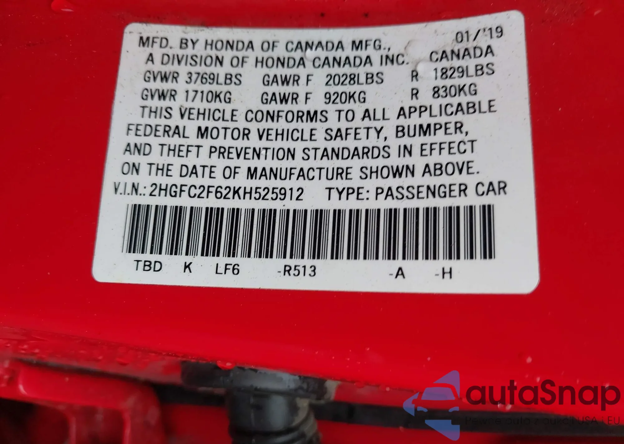 VIN: 2HGFC2F62KH525912