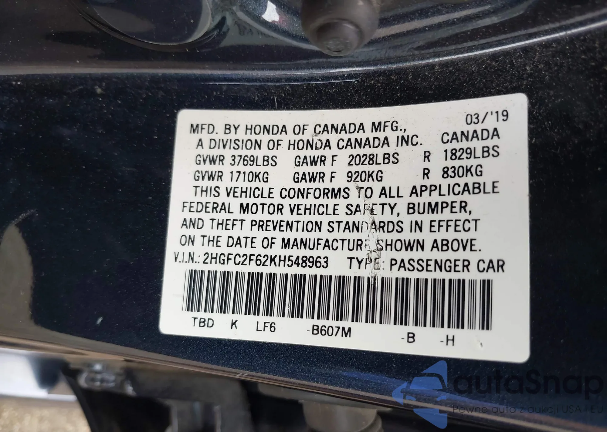 VIN: 2HGFC2F62KH548963