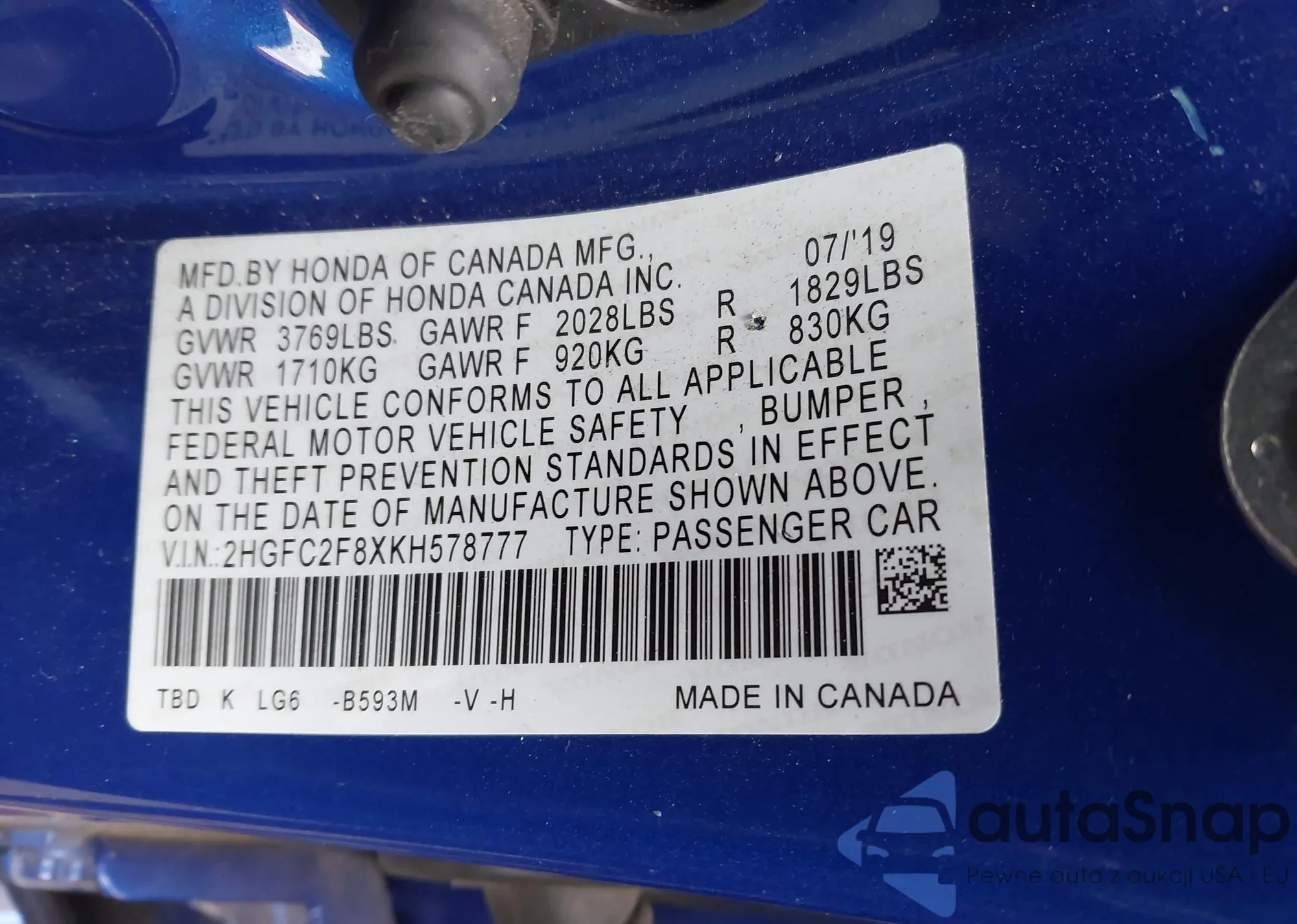 VIN: 2HGFC2F8XKH578777