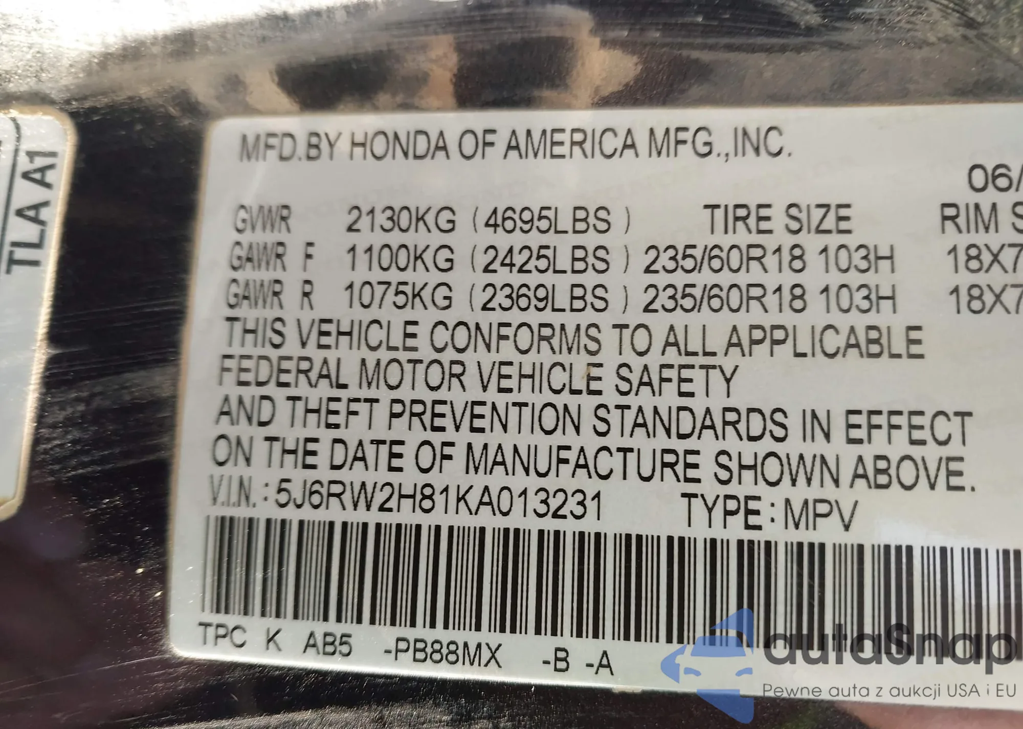 VIN: 5J6RW2H81KA013231