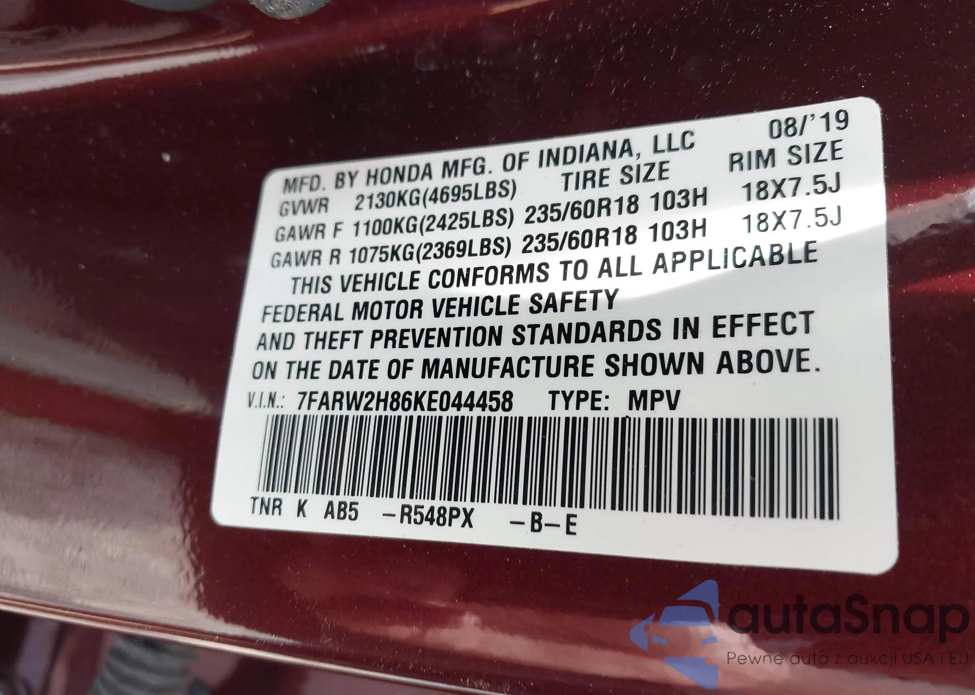 VIN: 7FARW2H86KE044458