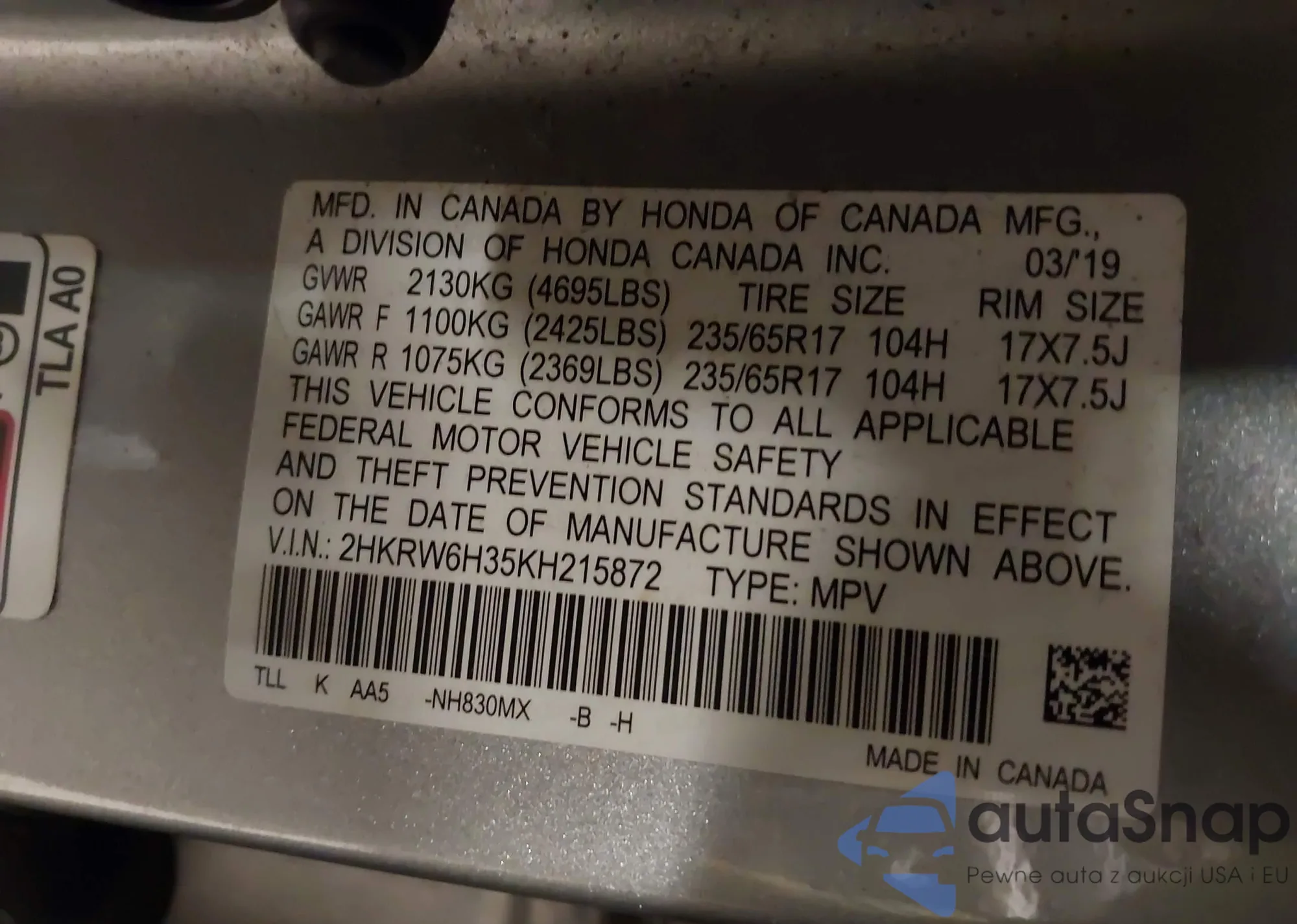 VIN: 2HKRW6H35KH215872