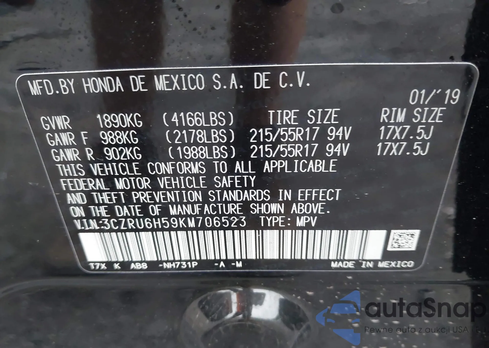 VIN: 3CZRU6H59KM706523