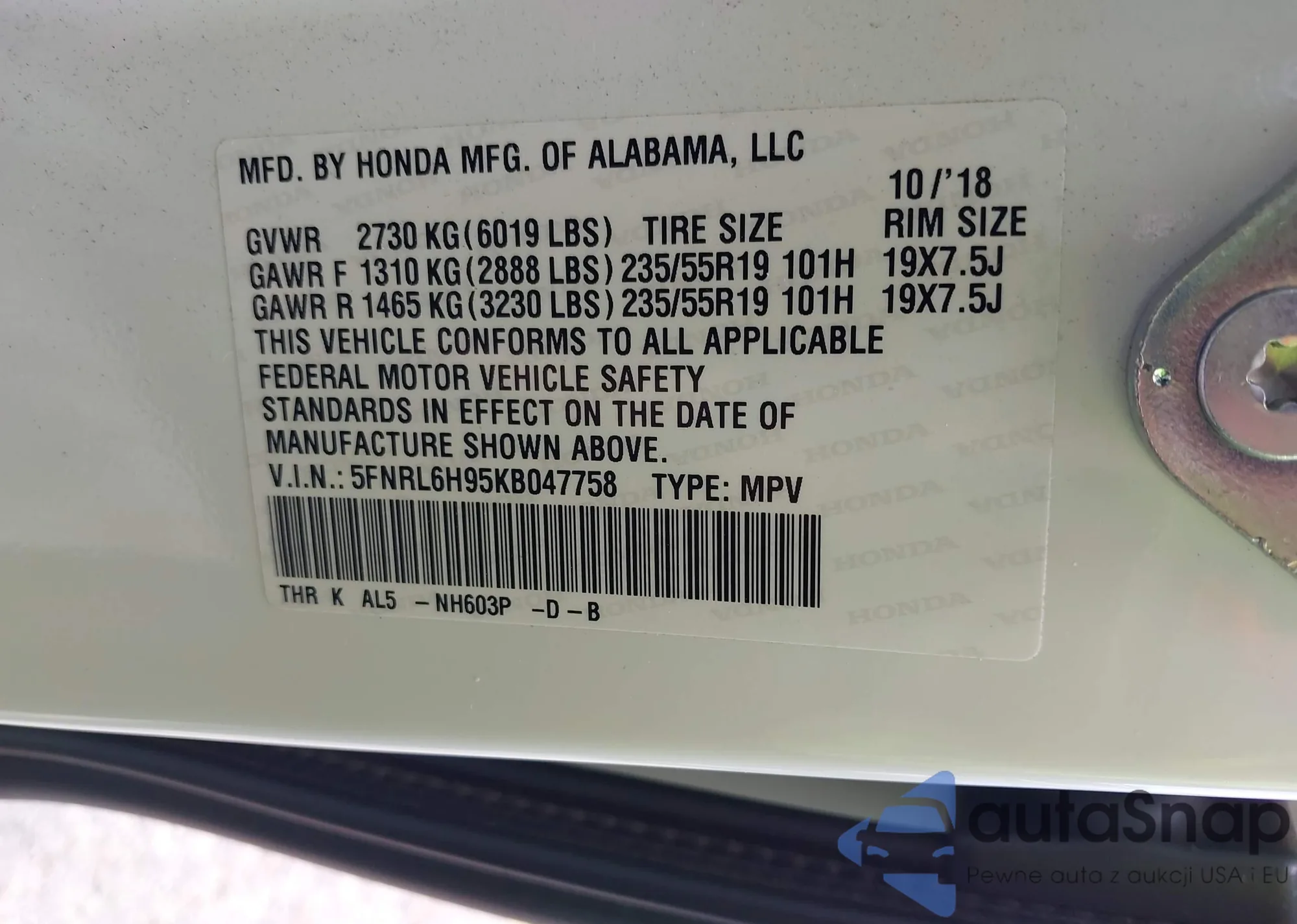 VIN: 5FNRL6H95KB047758