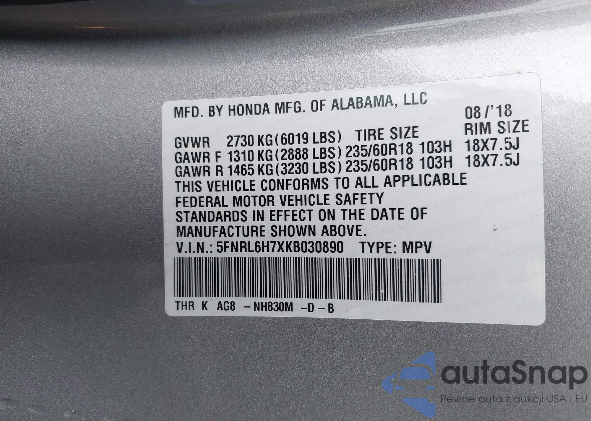 VIN: 5FNRL6H7XKB030890
