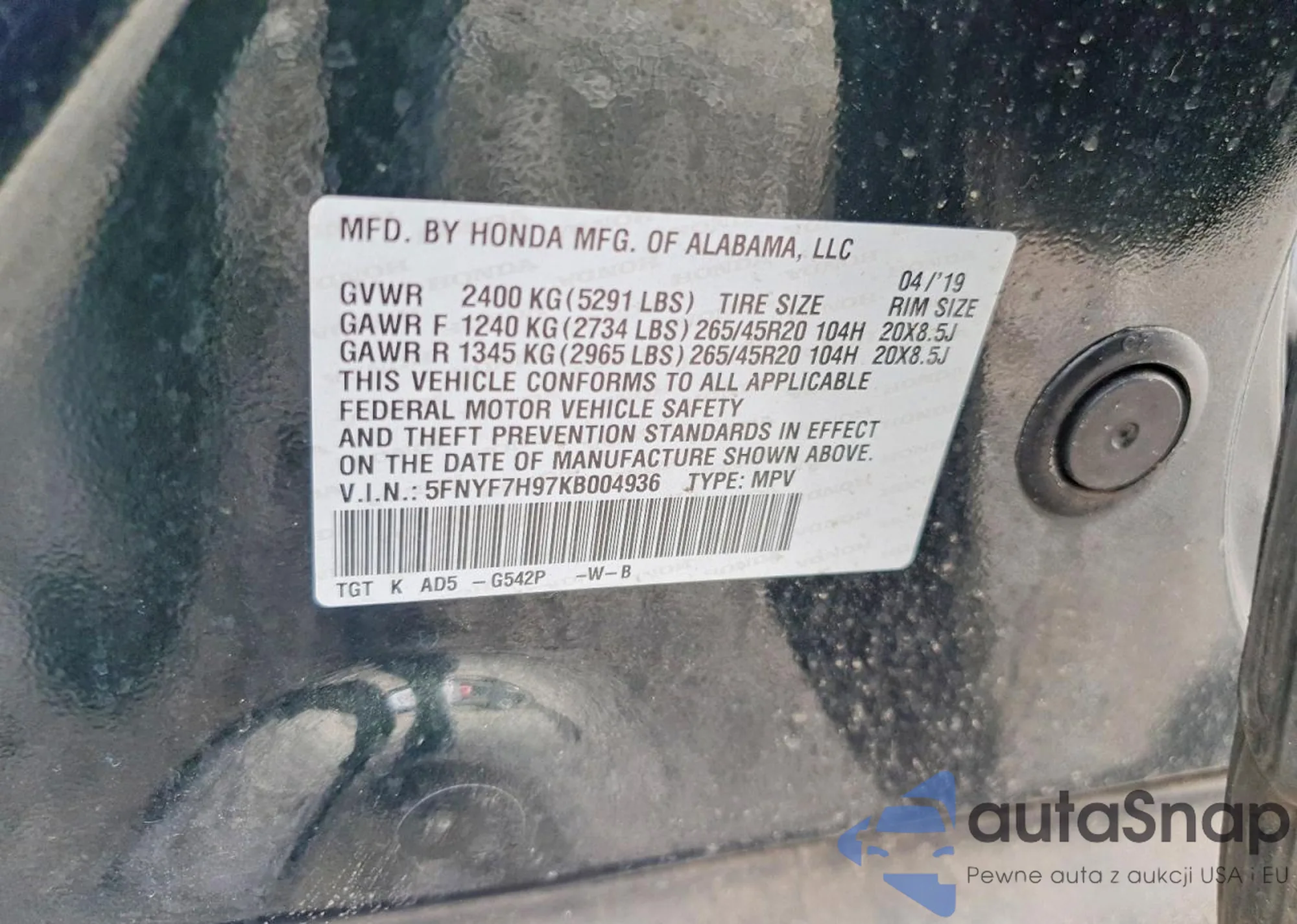 5FNYF7H97KB004936 COPART