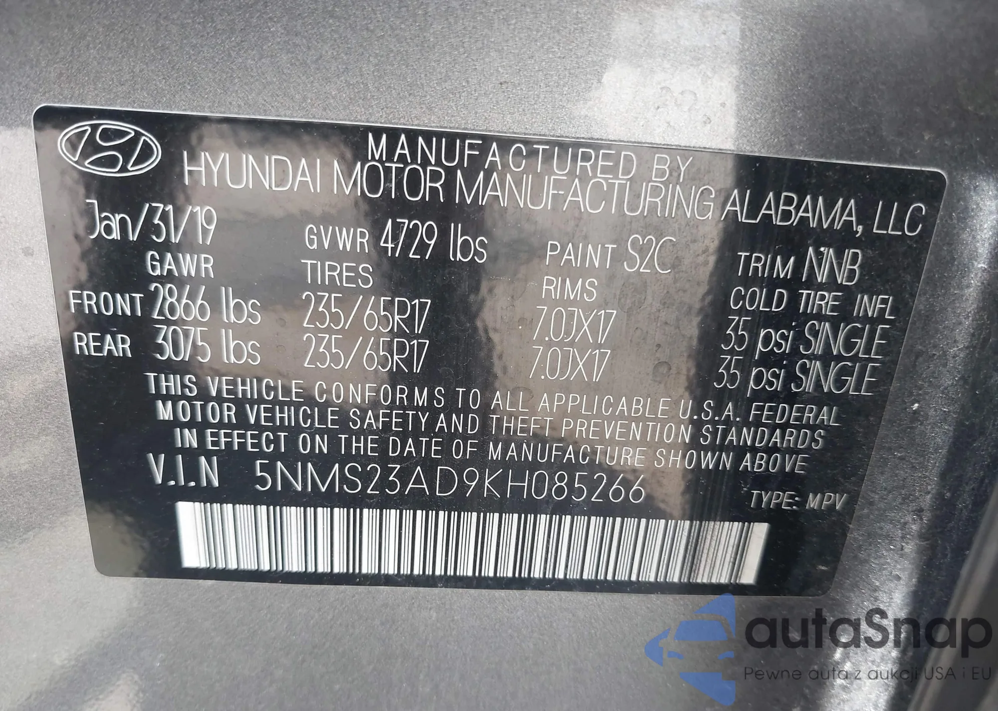 VIN: 5NMS23AD9KH085266