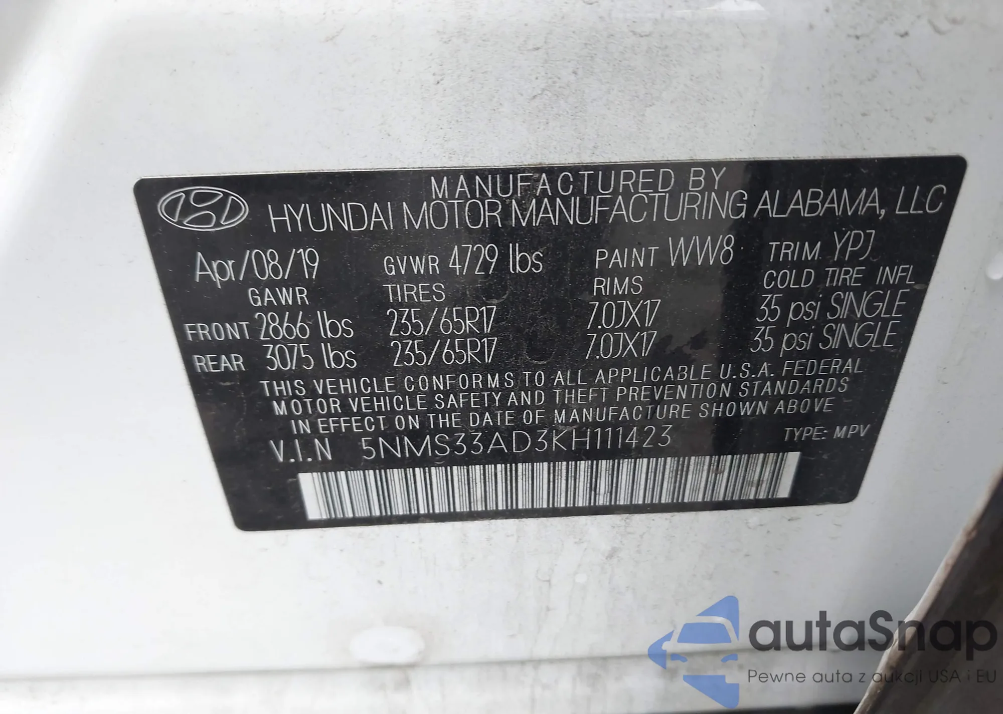 VIN: 5NMS33AD3KH111423