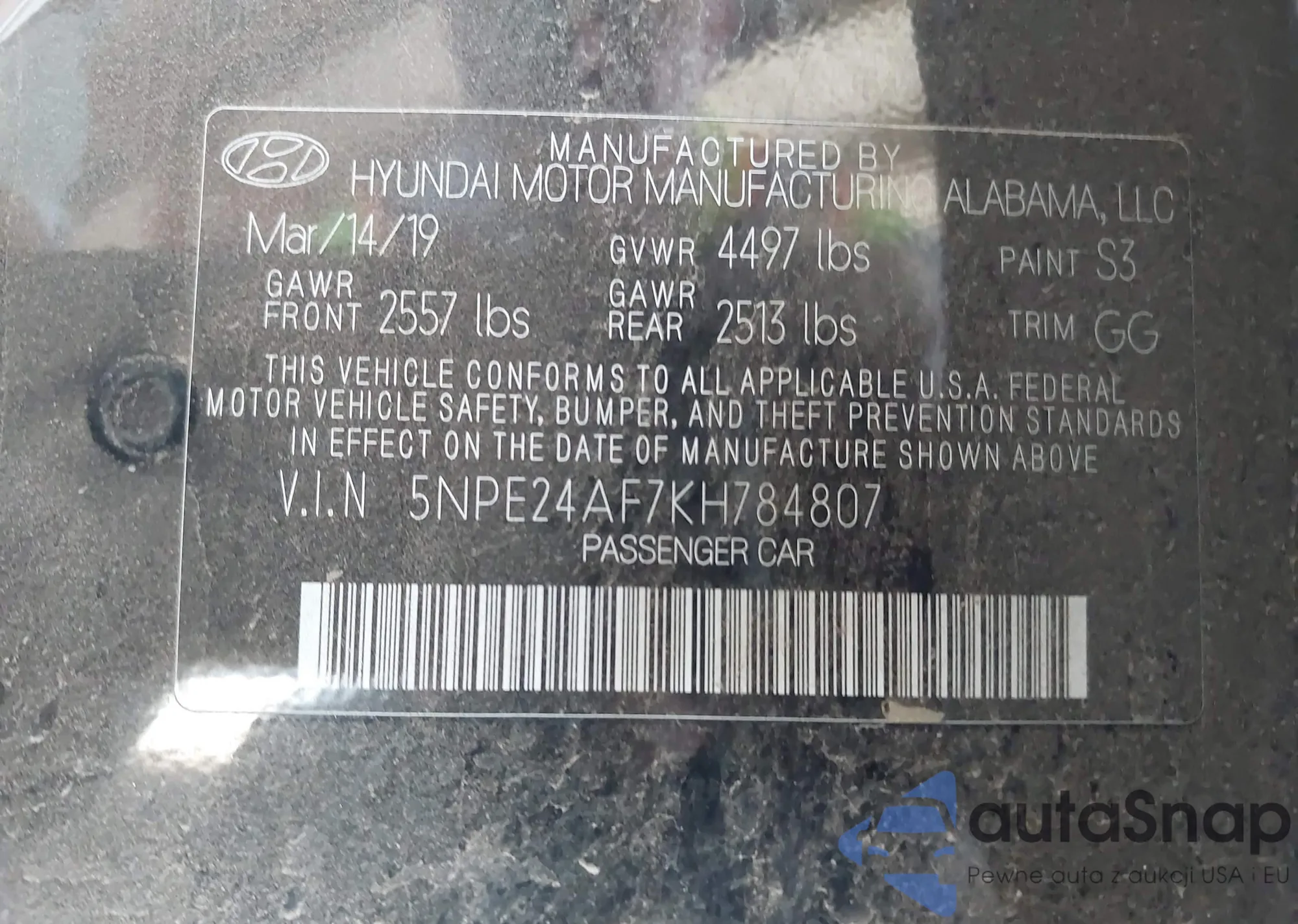 • VIN: 5NPE24AF7KH784807