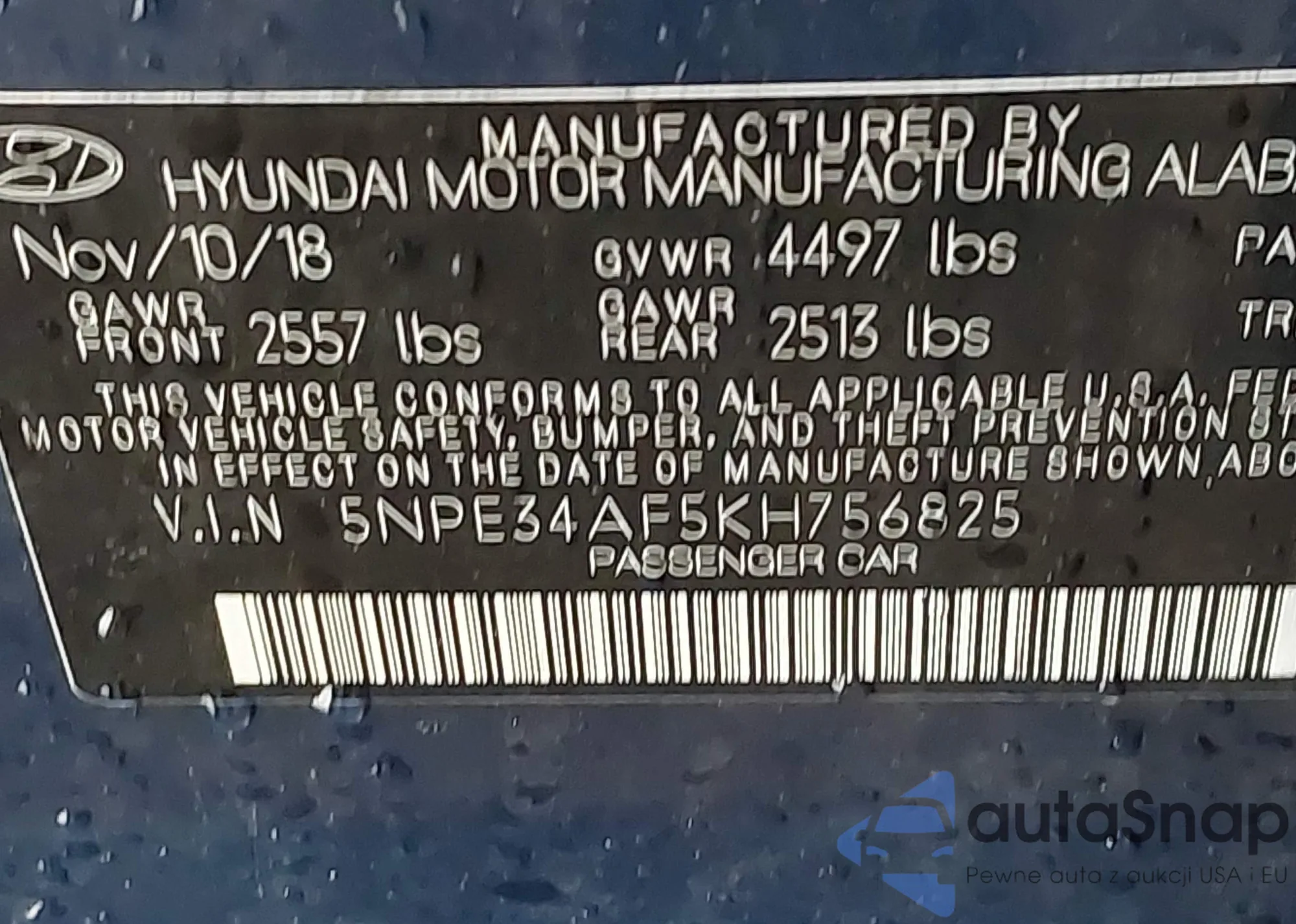 The car Hyundai Sonata 2019 (VIN 5NPE34AF5KH756825) has not been auctioned before. The documents are clean, and the mileage matches or is below the market average. Sold by an insurance company – we recommend purchase. Delivery to the port will take approx. 6–8 weeks.