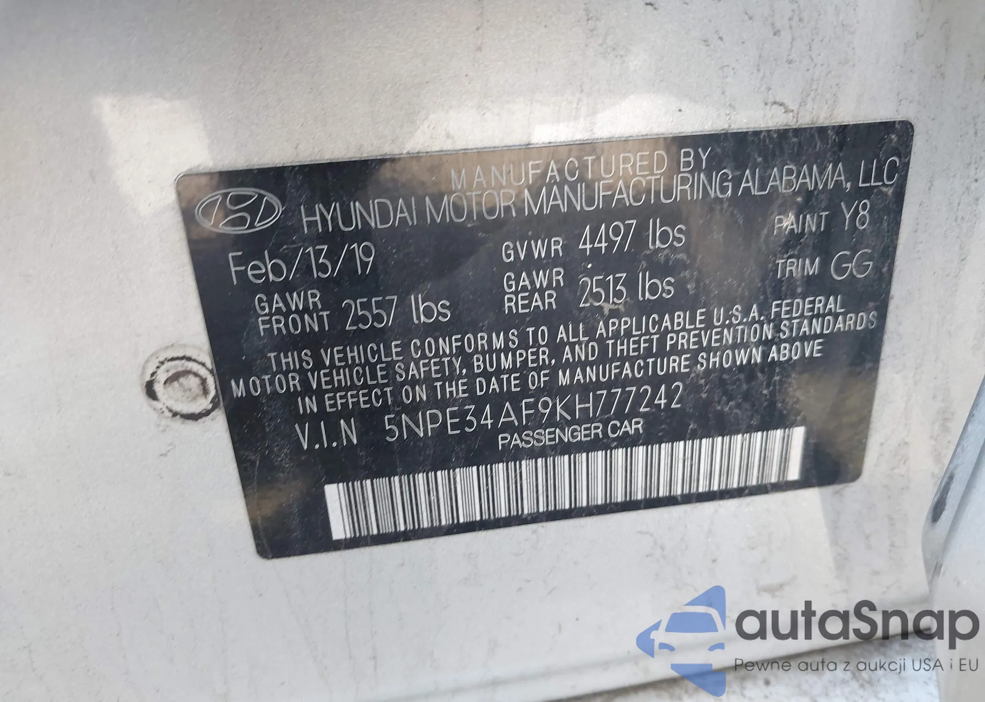VIN: 5NPE34AF9KH777242