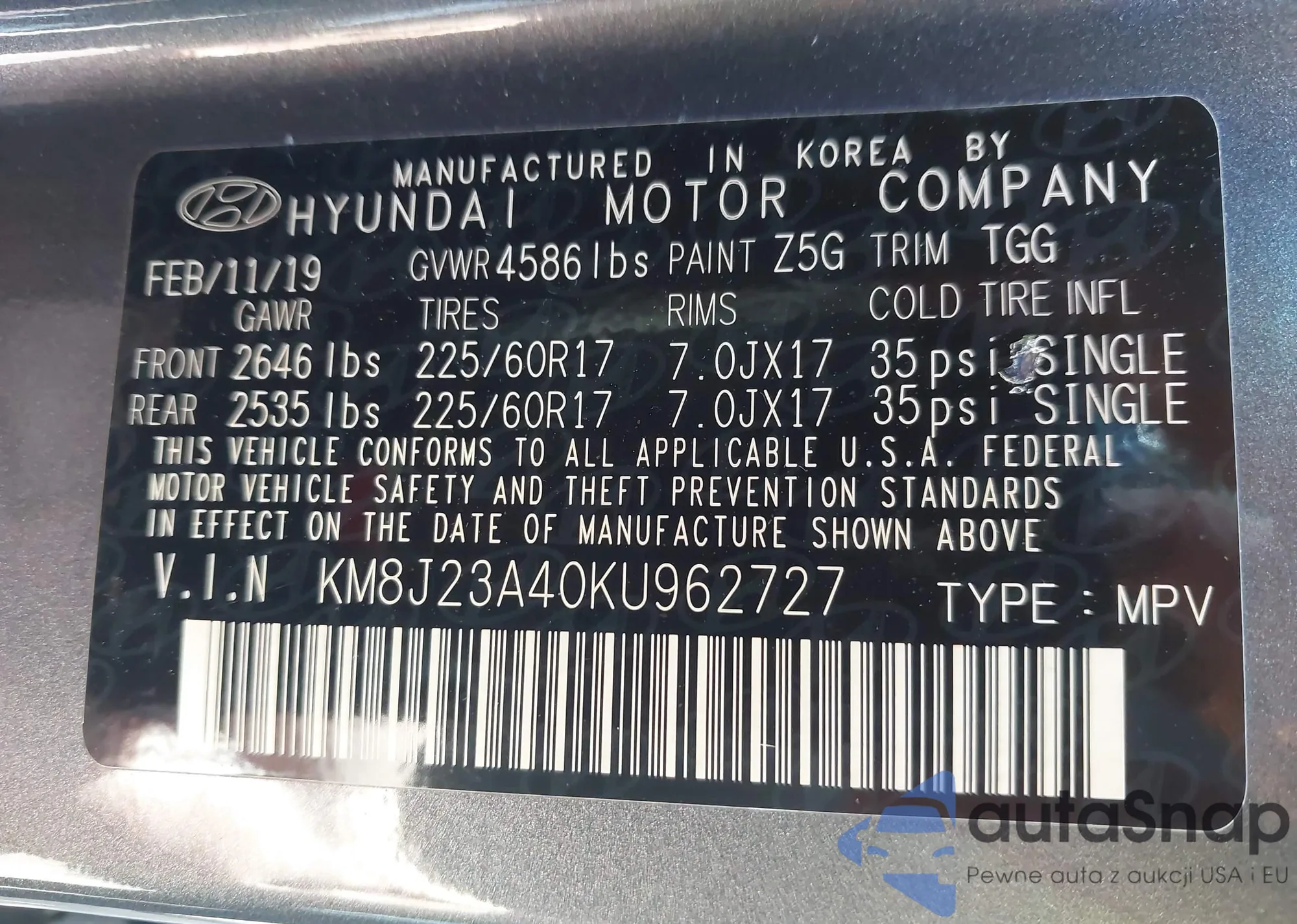 VIN: KM8J23A40KU962727