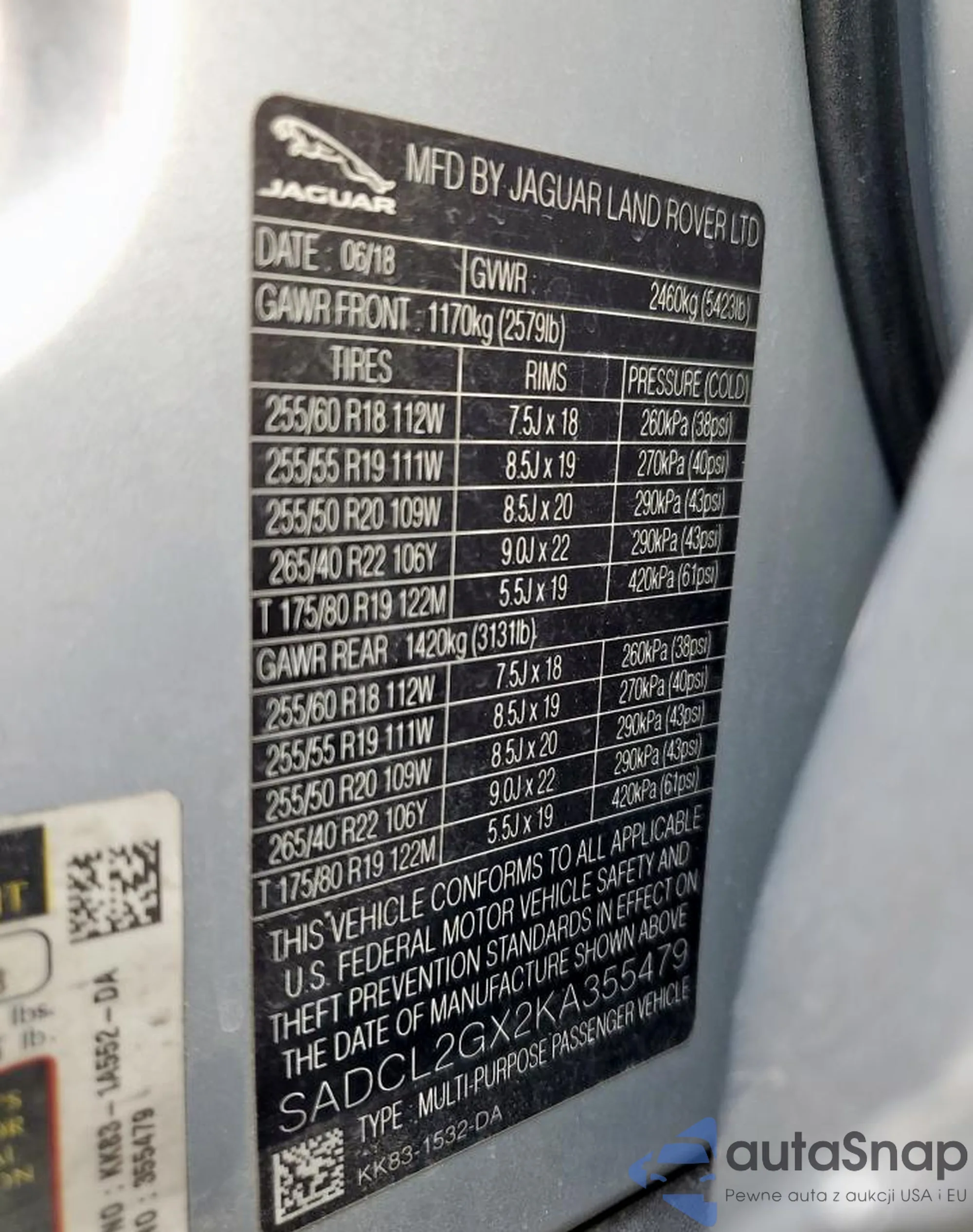 The car Jaguar F-Pace 2019 (VIN SADCL2GX2KA355479) has not been auctioned before. The documents are clean, and the mileage matches or is below the market average. Sold by an insurance company – we recommend purchase. Delivery to the port will take approx. 6–8 weeks.
