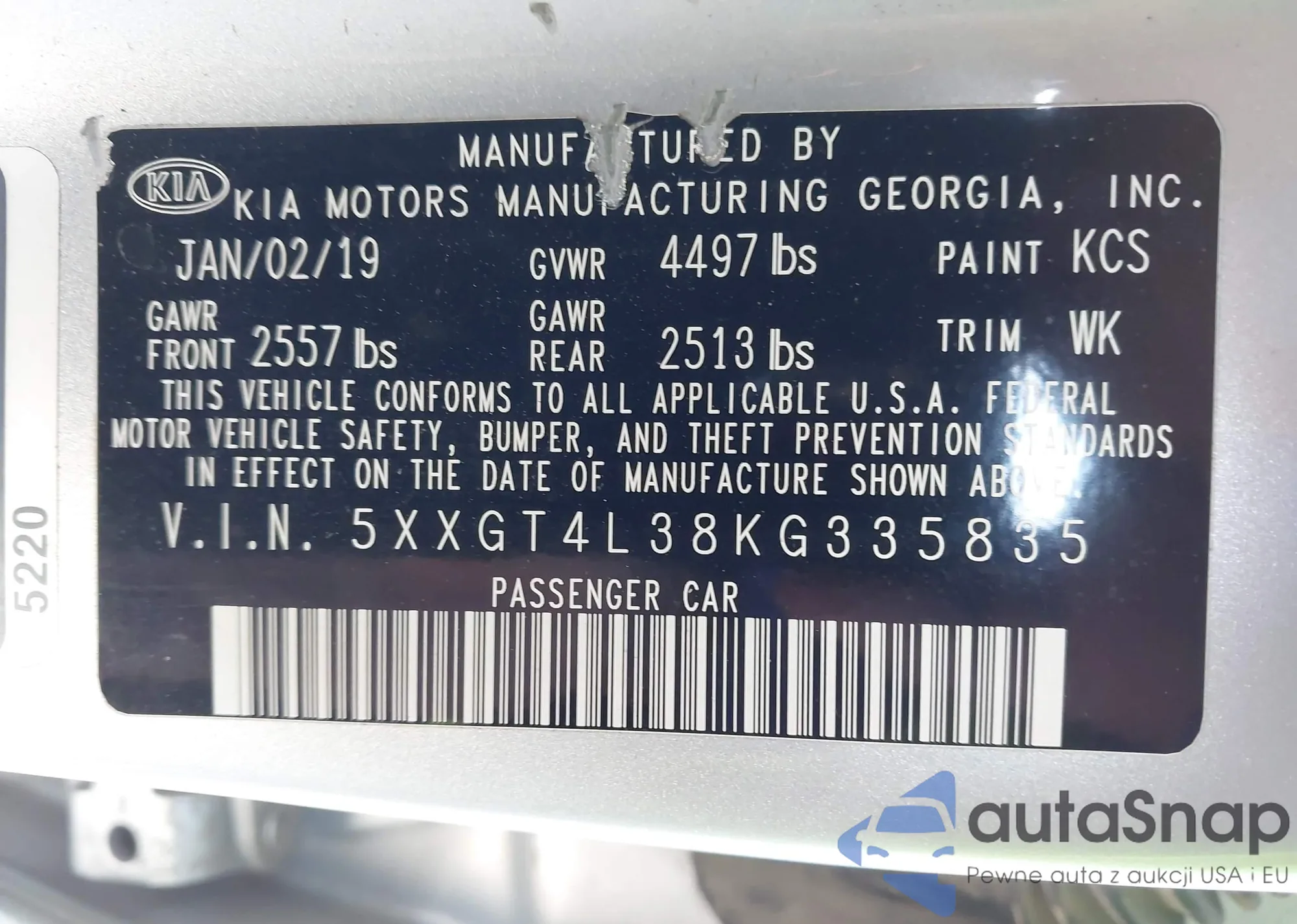 The car Kia Optima 2019 (VIN 5XXGT4L38KG335835) has not been auctioned before. The documents are clean, and the mileage matches or is below the market average. Sold by an insurance company – we recommend purchase. Delivery to the port will take approx. 6–8 weeks.