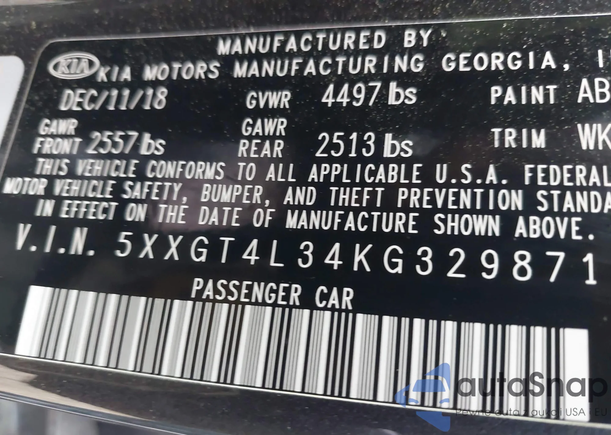 VIN: 5XXGT4L34KG329871