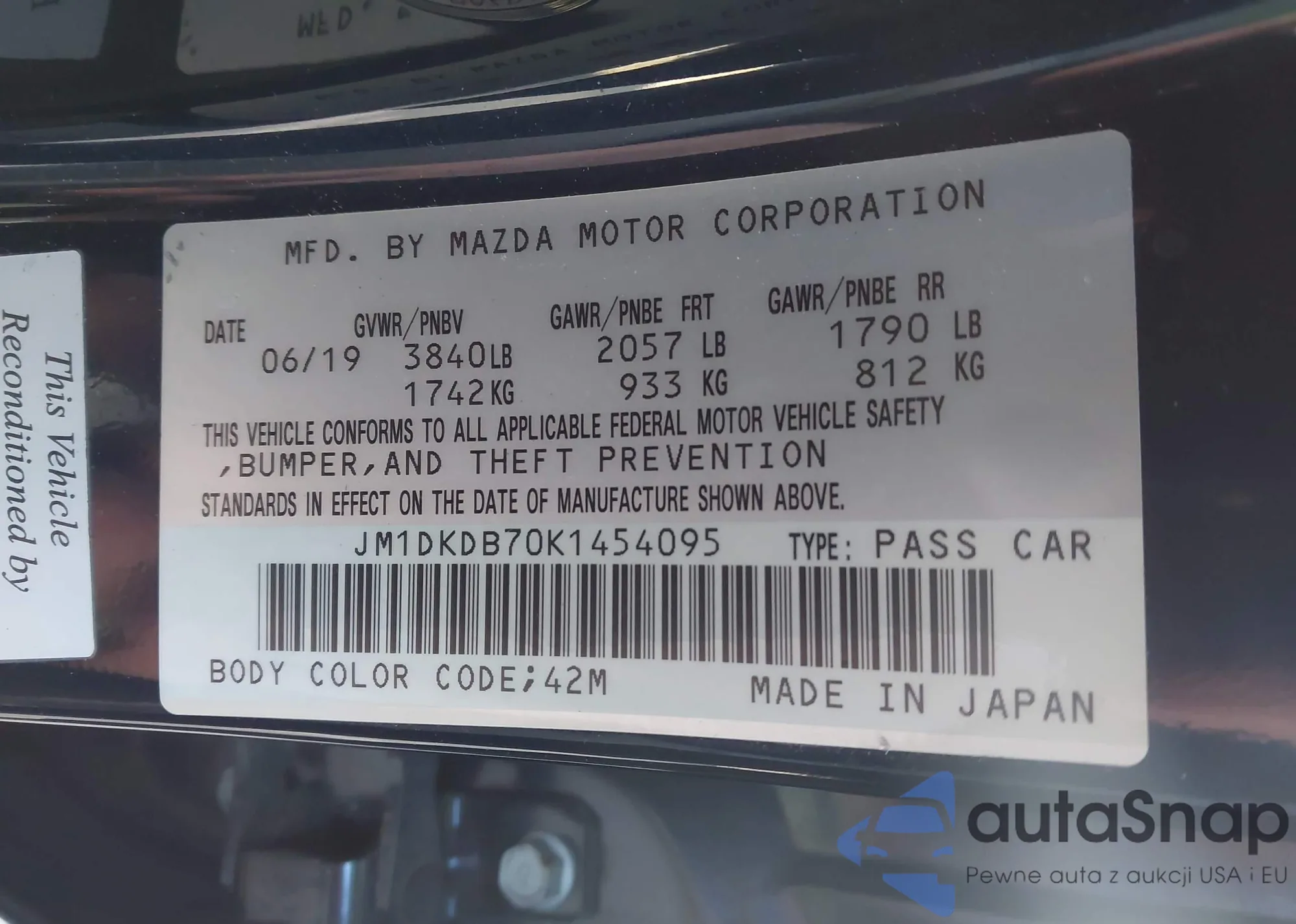 The car Mazda CX-3 2019 (VIN JM1DKDB70K1454095) has not been auctioned before. The documents are clean, and the mileage matches or is below the market average. Sold by an insurance company – we recommend purchase. Delivery to the port will take approx. 6–8 weeks.