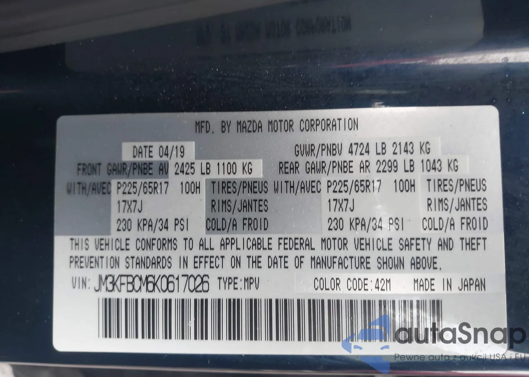 The car Mazda CX-5 2019 (VIN JM3KFBCM6K0617026) has not been auctioned before. The documents are clean, and the mileage matches or is below the market average. Sold by an insurance company – we recommend purchase. Delivery to the port will take approx. 6–8 weeks.