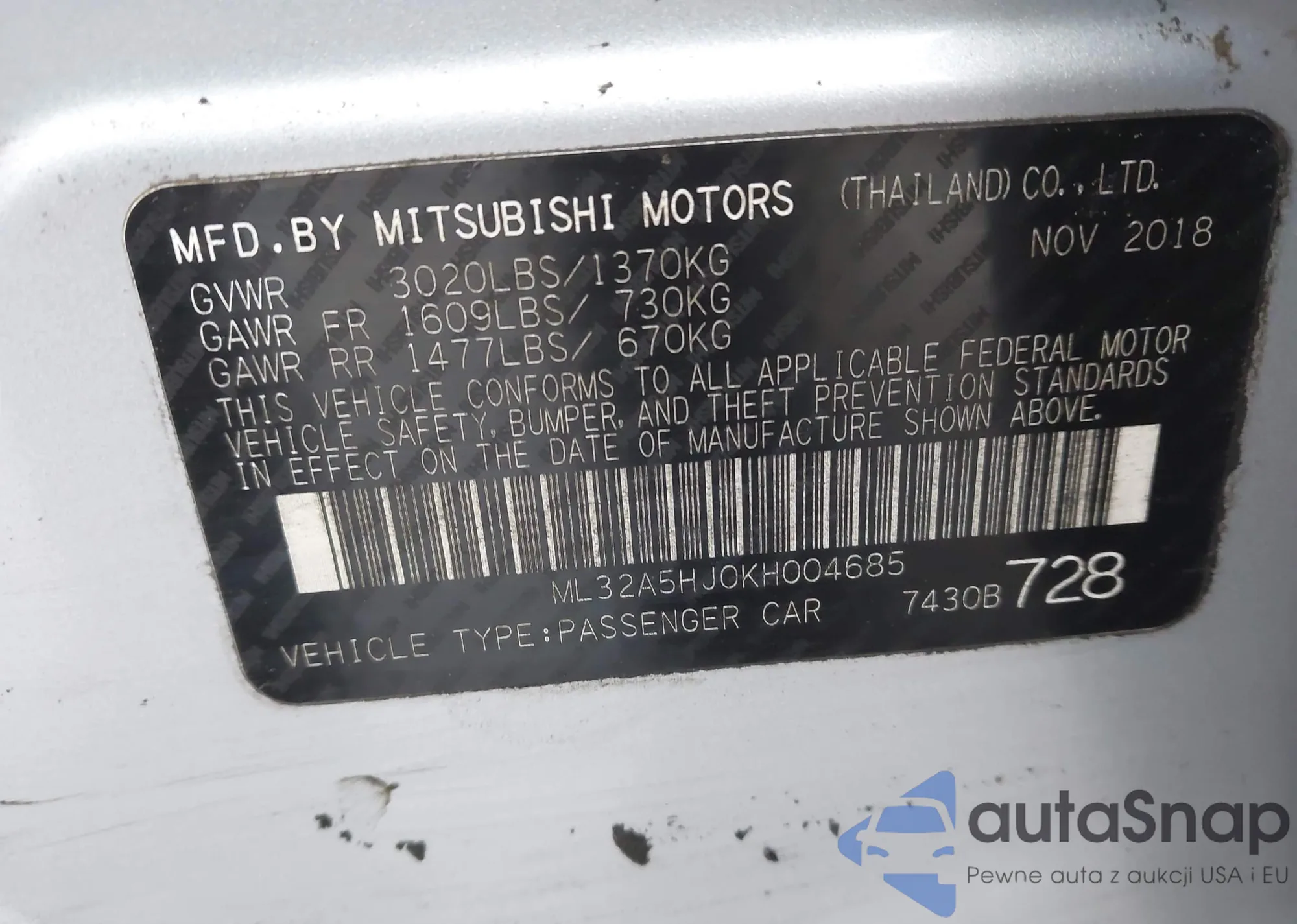 The car Mitsubishi Mirage 2019 (VIN ML32A5HJ0KH004685) has not been auctioned before. The documents are clean, and the mileage matches or is below the market average. Sold by an insurance company – we recommend purchase. Delivery to the port will take approx. 6–8 weeks.