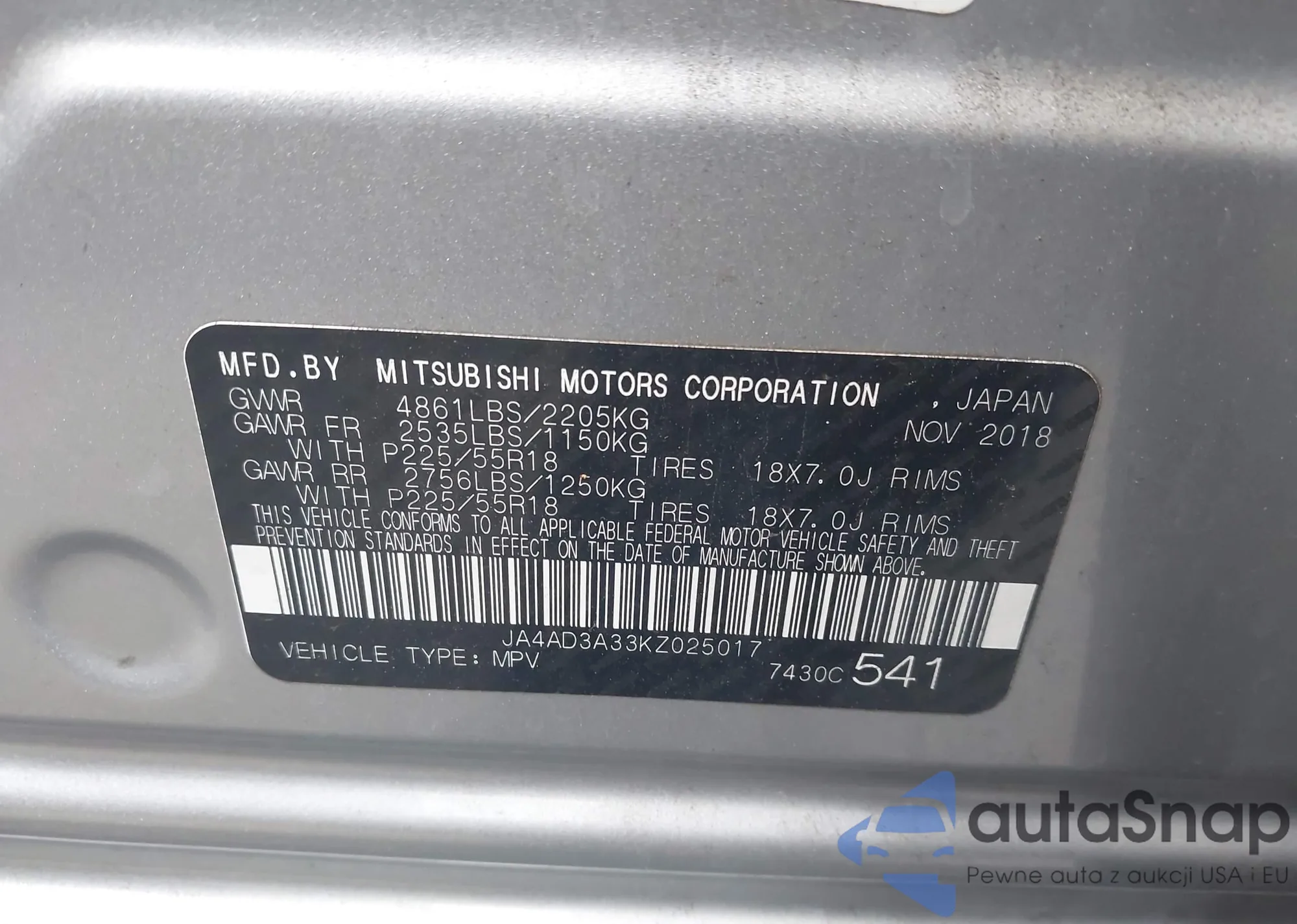 The car Mitsubishi Outlander 2019 (VIN JA4AD3A33KZ025017) has not been auctioned before. The documents are clean, and the mileage matches or is below the market average. Sold by an insurance company – we recommend purchase. Delivery to the port will take approx. 6–8 weeks.