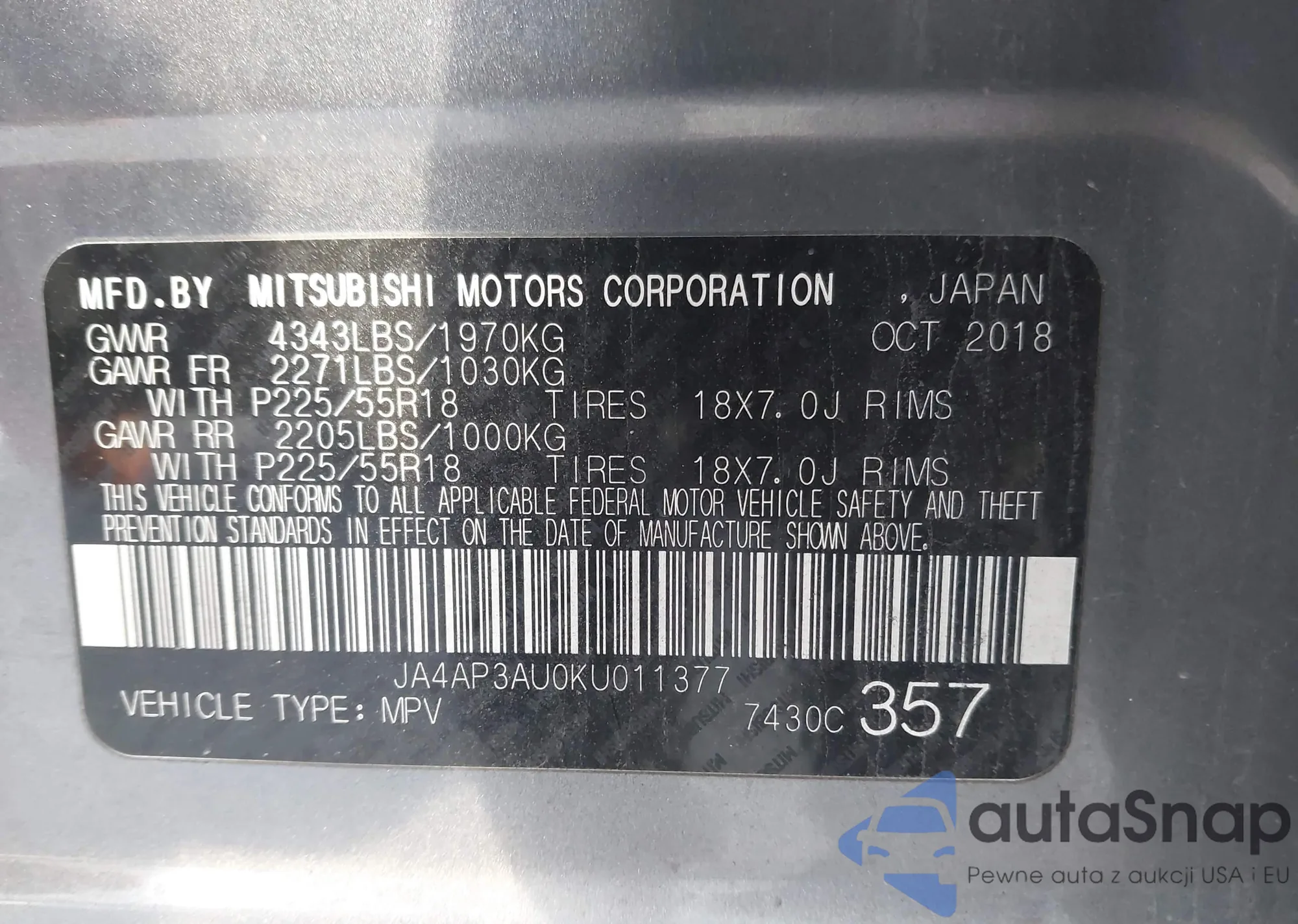 • VIN: JA4AP3AU0KU011377