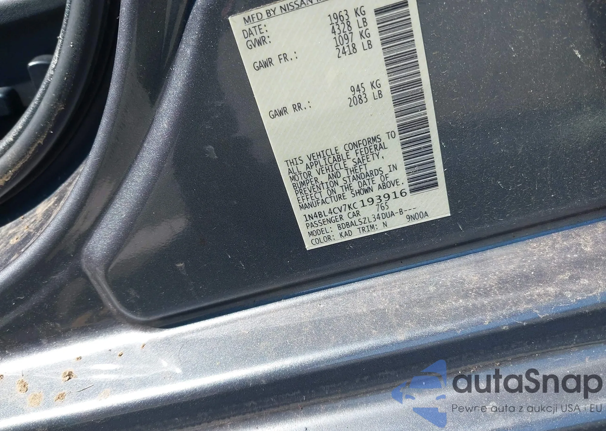 VIN: 1N4BL4CV7KC193916