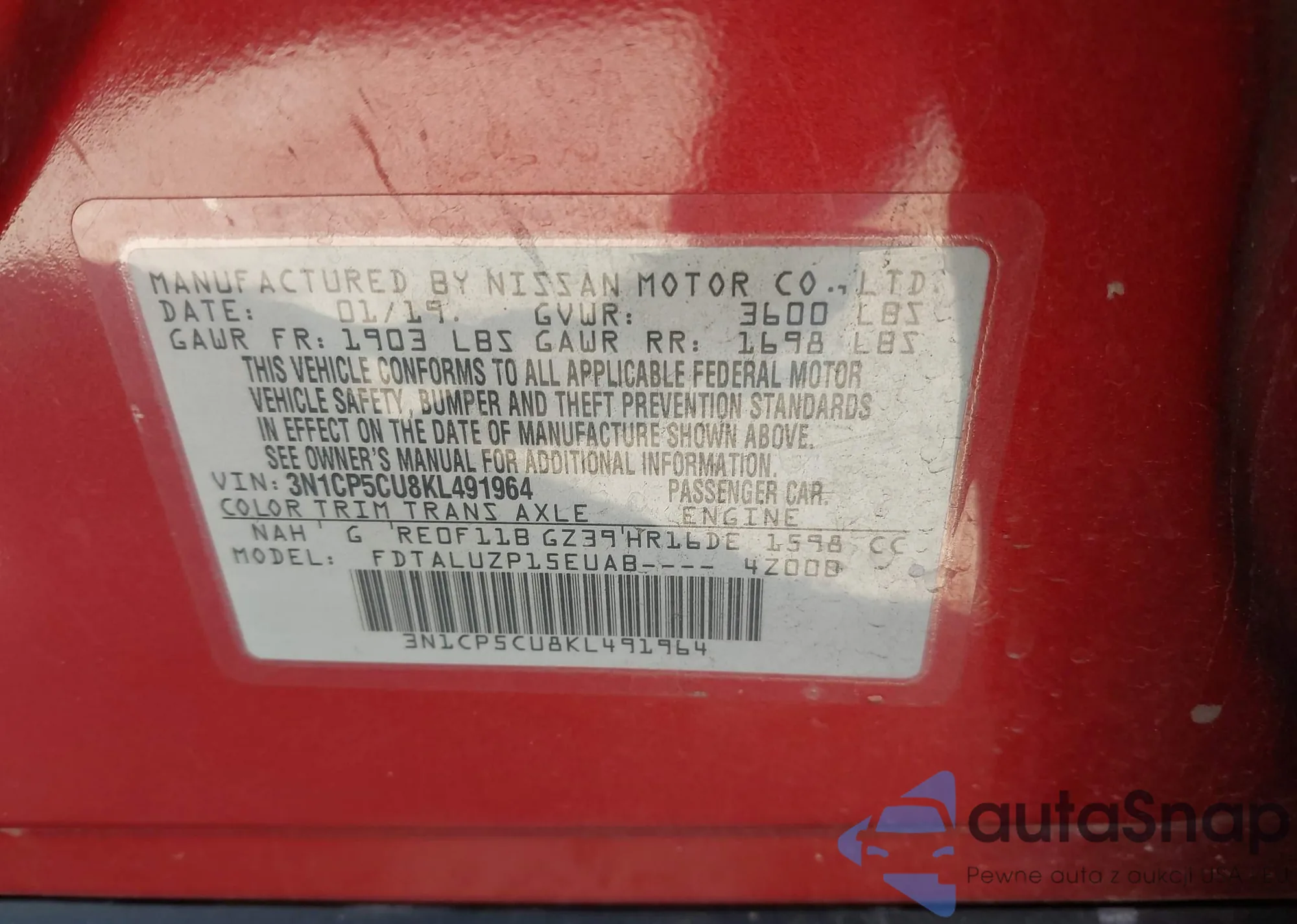 • VIN: 3N1CP5CU8KL491964